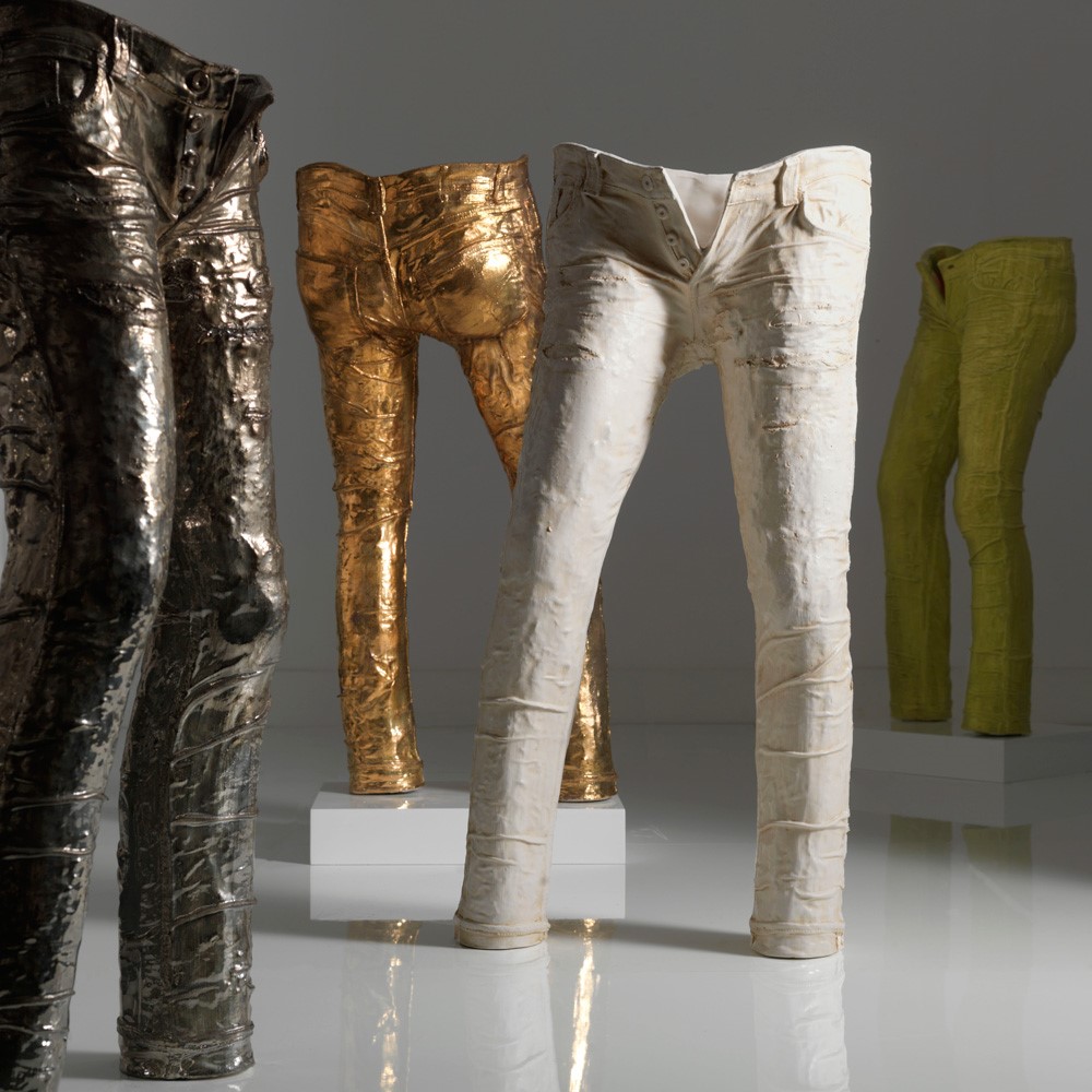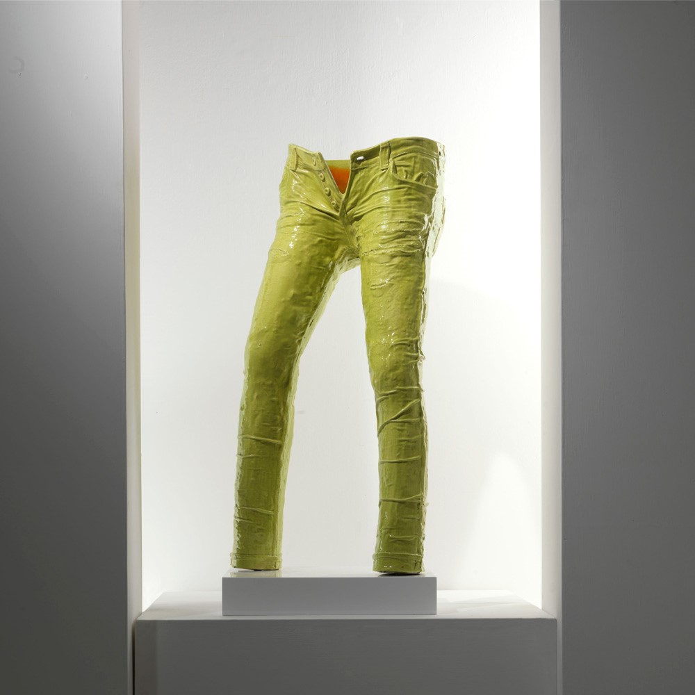 Hand made majolica jeans, green glazed version. Glossy-white lacquered wooden base.