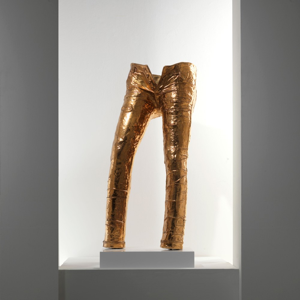 Hand made majolica jeans, real gold plated version. Glossy-white lacquered wooden base.