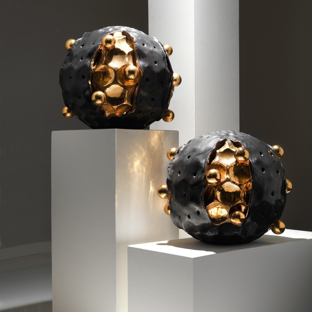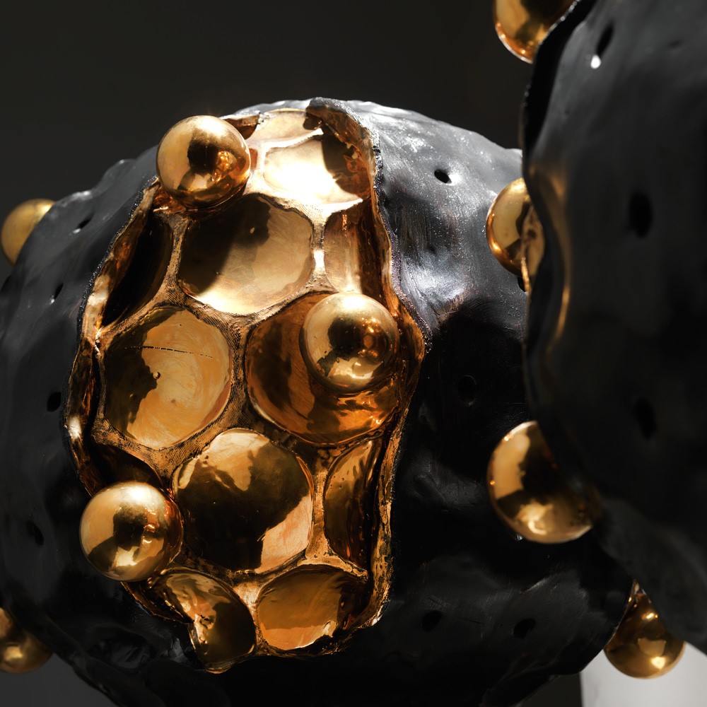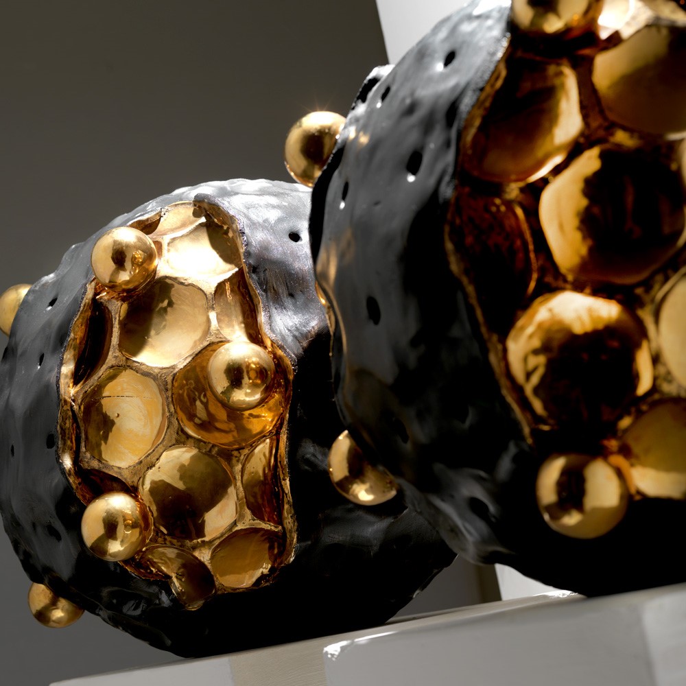 Giant majolica sculpture, aged real gold plated, hand engraved and glazed..