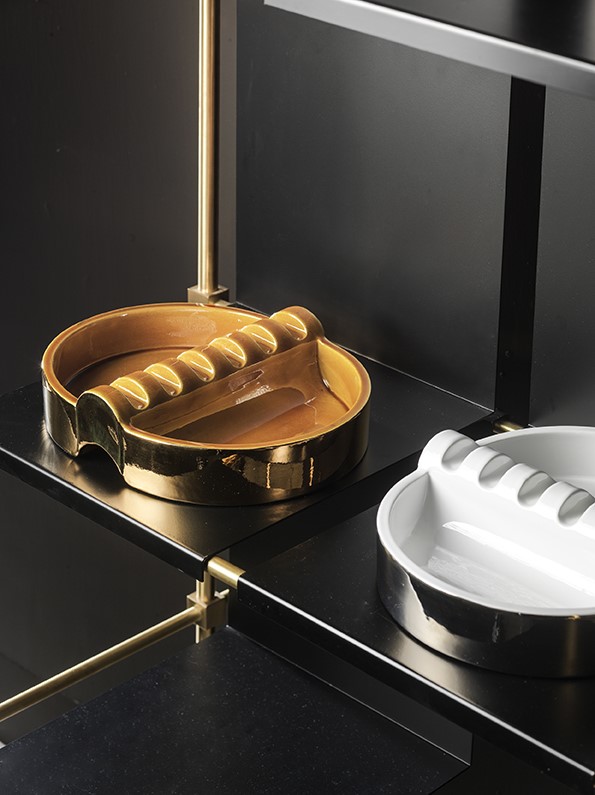 Ashtray or centerpiece in glaze majolica and plated with gold or platinum. Amber glaze.