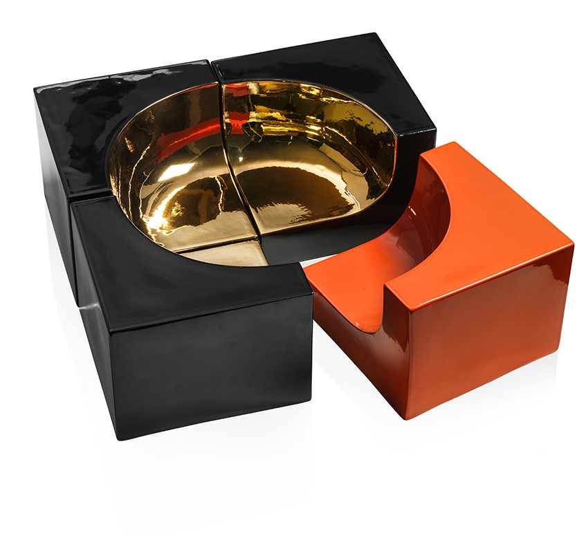 Module in glaze majolica and plated with gold. Is a sculpture, object that due to its modular form can be duplicated. Orange glaze.