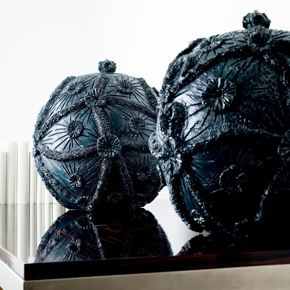 Hand turned and engraved big majolica potiche. Hand decorated and glazed with chromed brass little details.