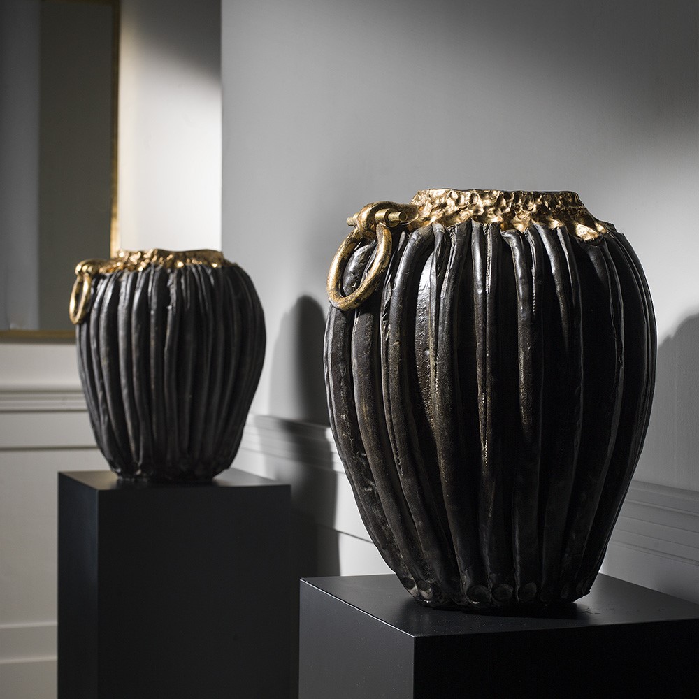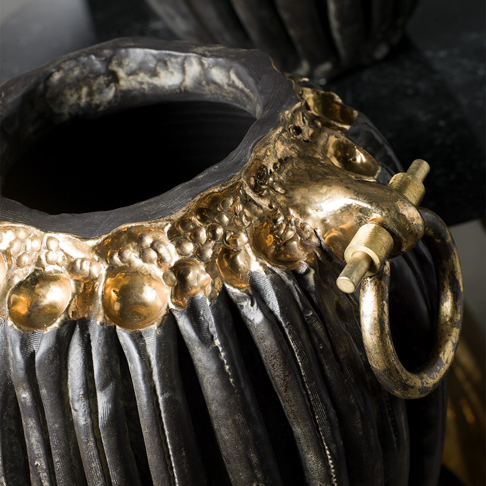 Majolica vase handmade decorated with pure aged gold and metal handle hand-forged.