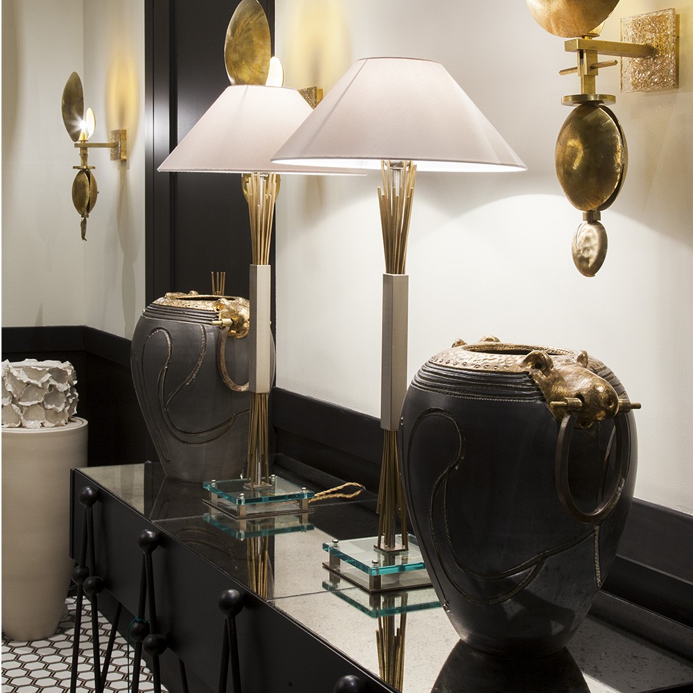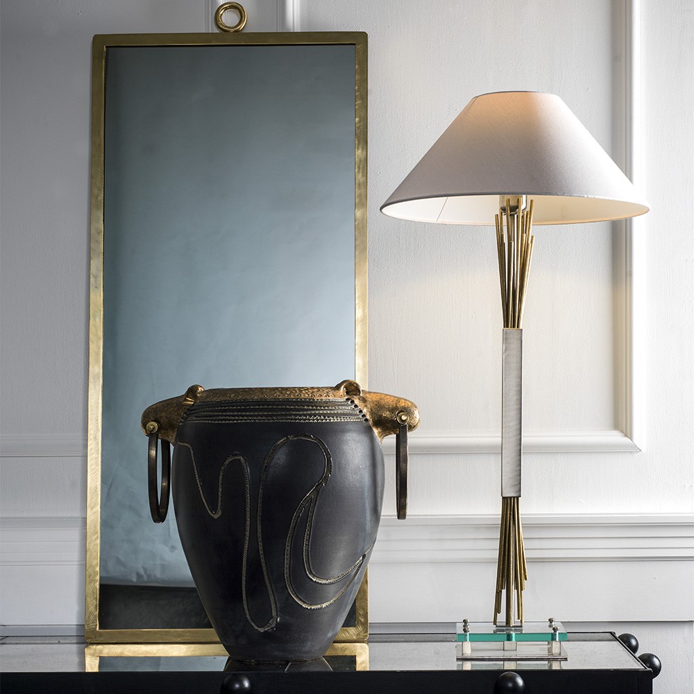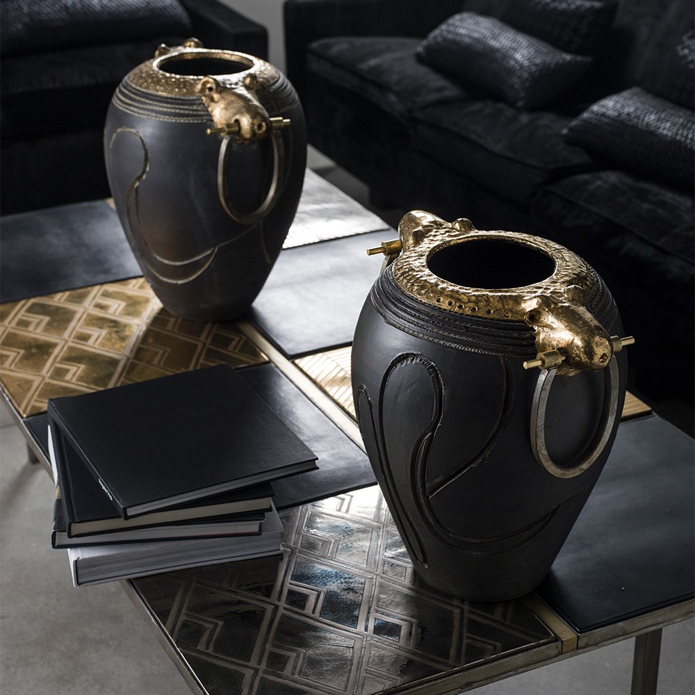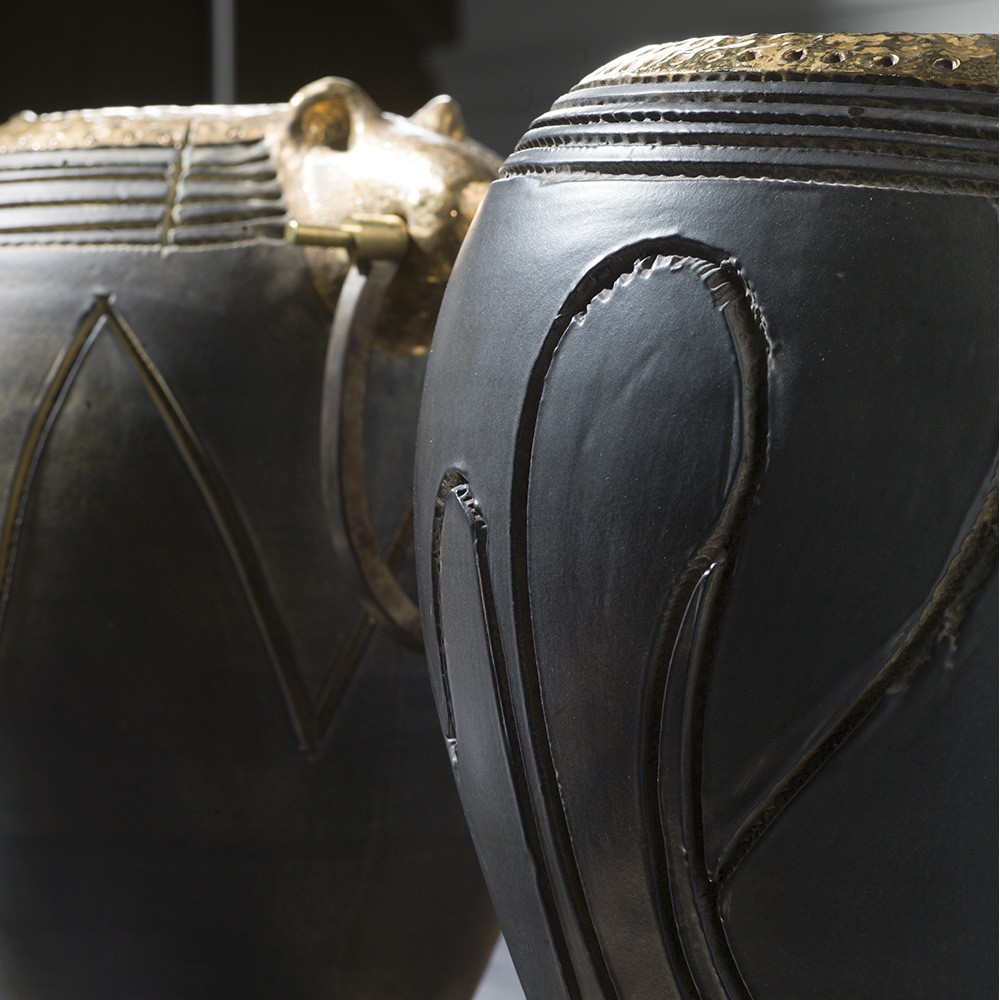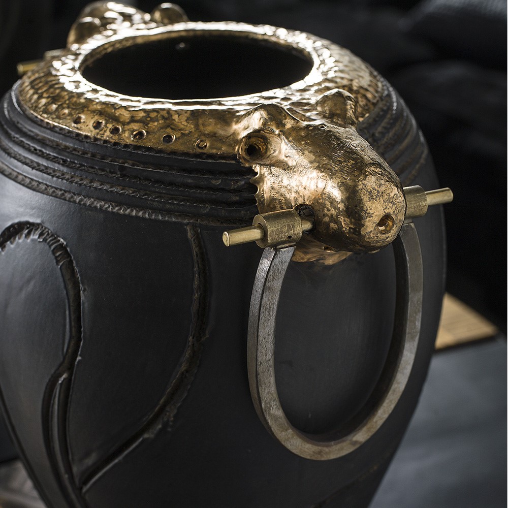 Majolica vase handmade decorated with pure aged gold and metal handles hand-forged.
