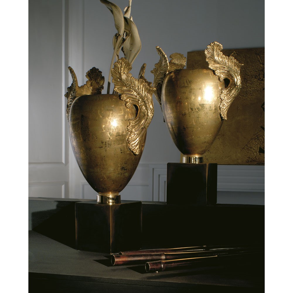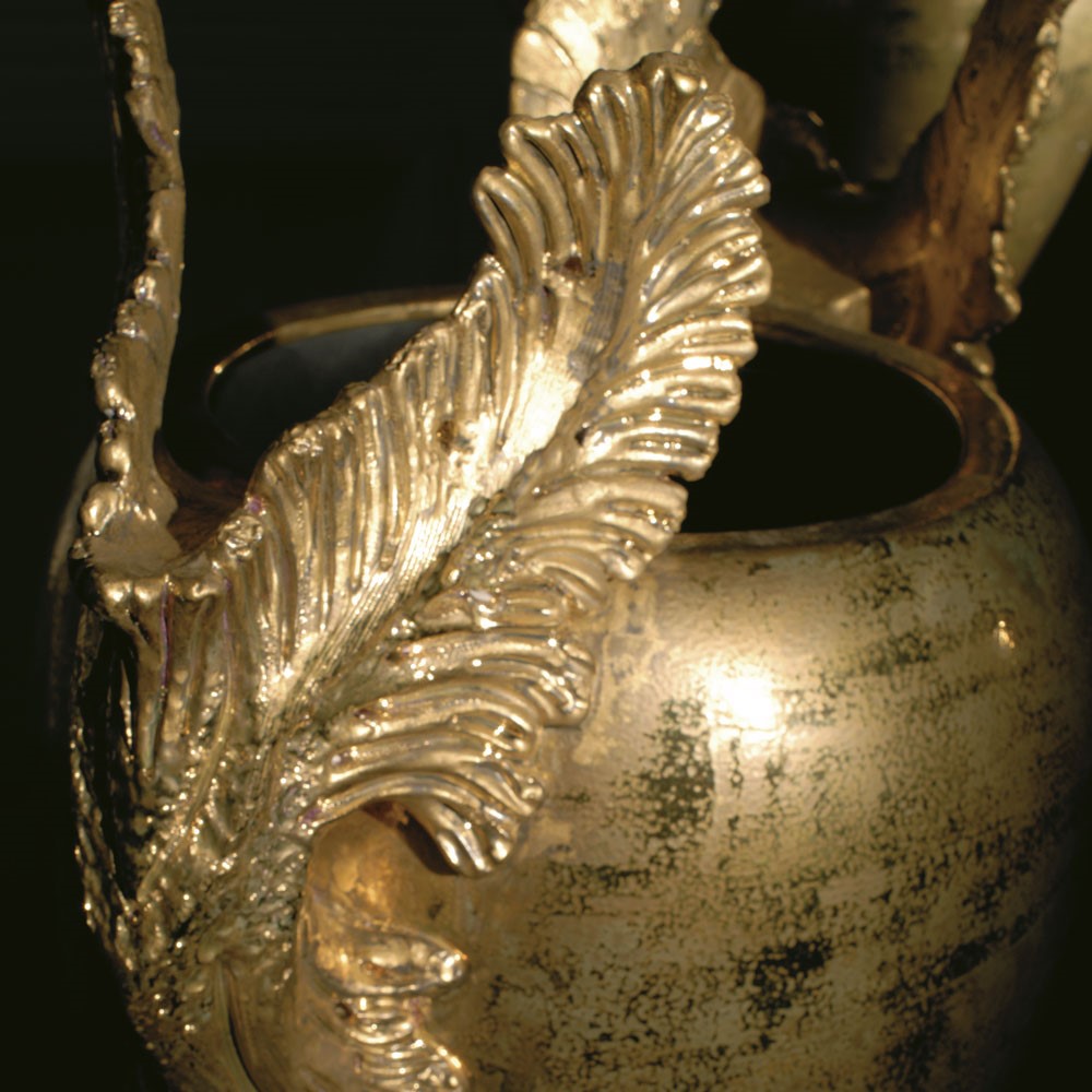 Hand engraved and glazed majolica vase, gold plated. Lacquered wooden base with golden brass details.
