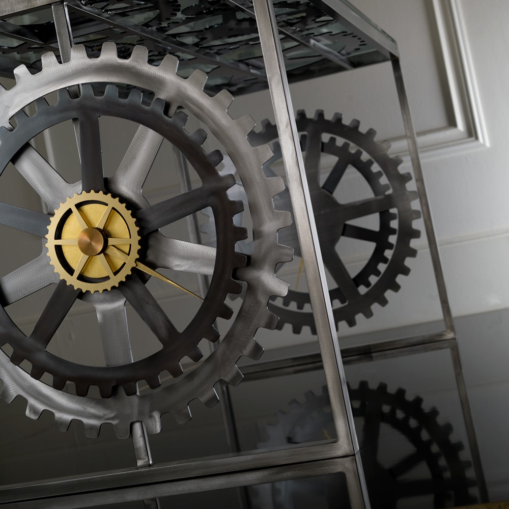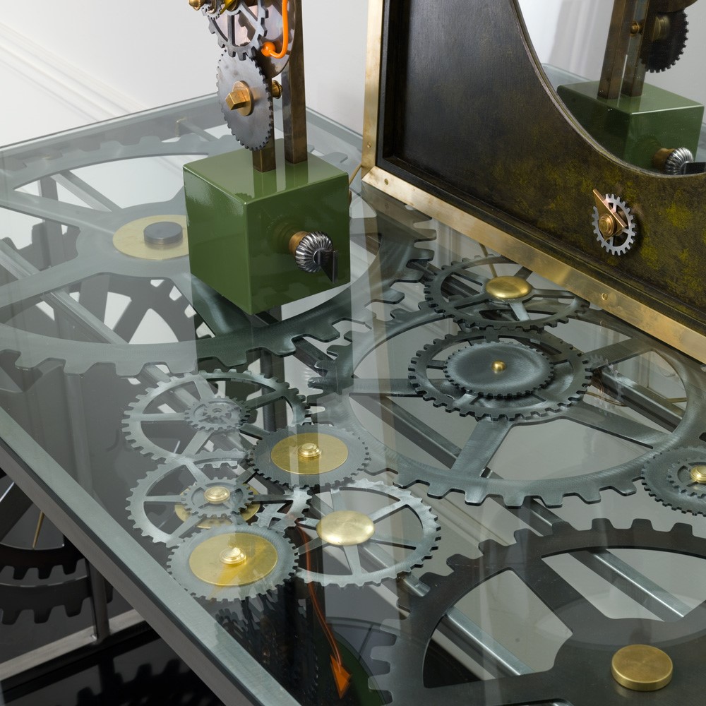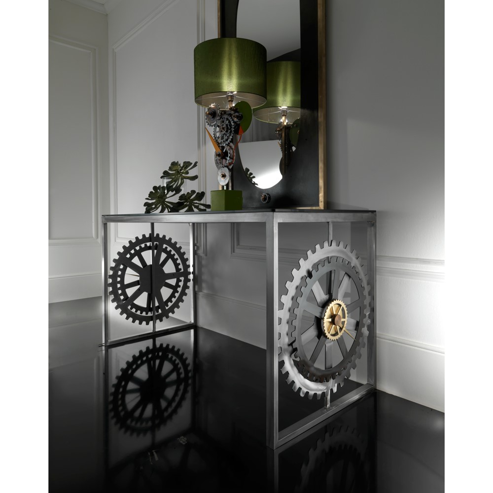 Console table in steel structure. In iron in pewter and nikle finish are the gearwheels, brass details.