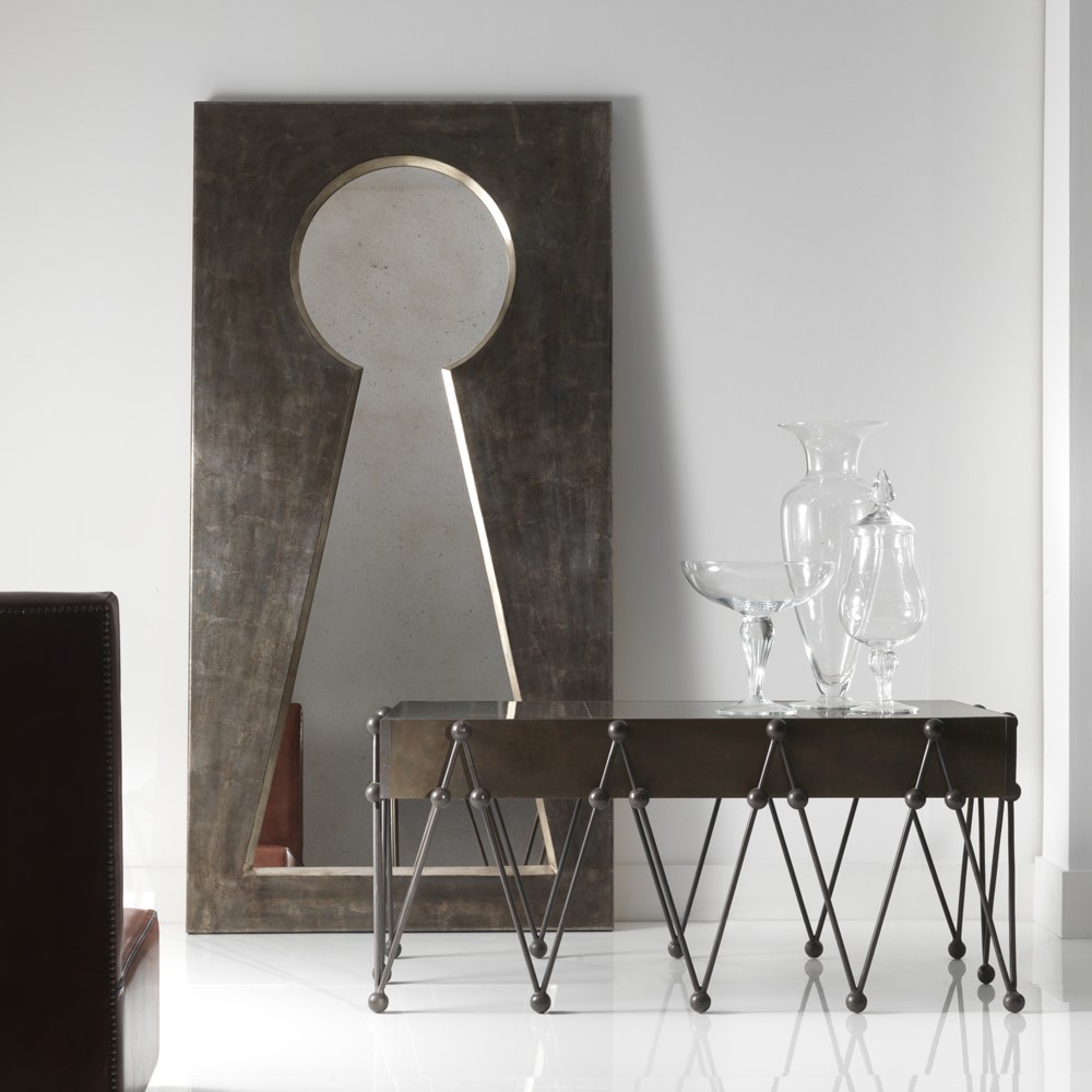 Hand welded iron table, matt green/grey lacquered. Sufrace composed by aged mirrors.