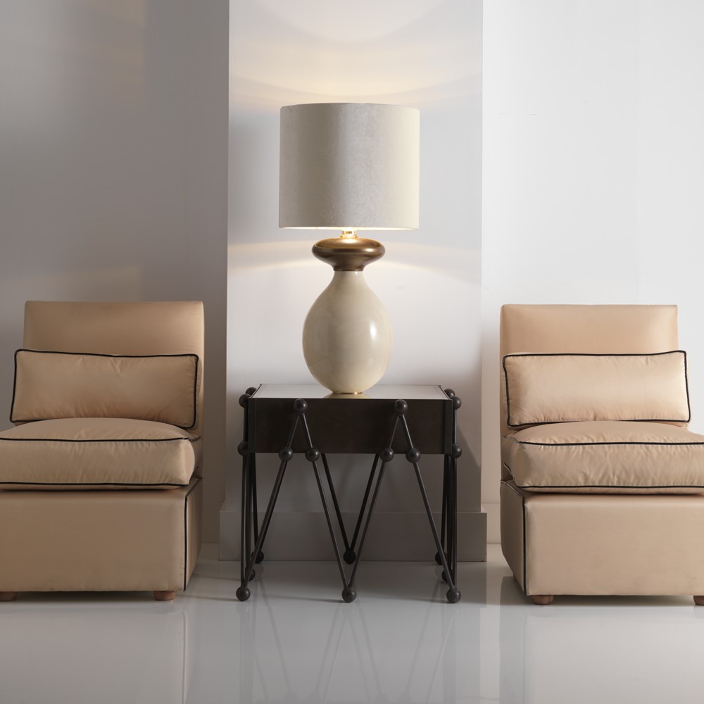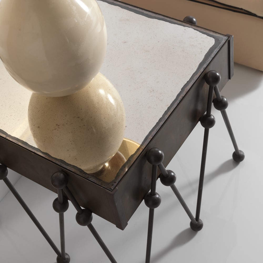 Hand welded iron table, matt green/grey lacquered. Surface with aged mirror.