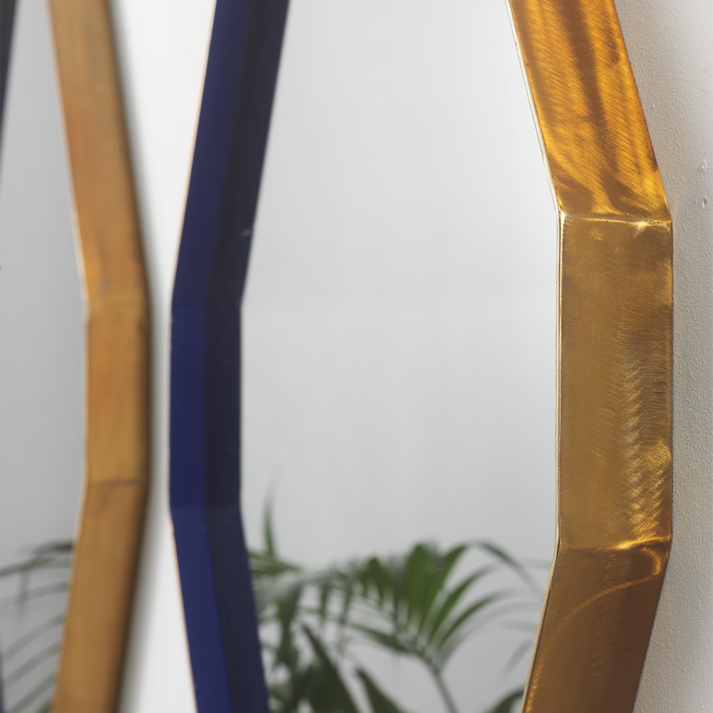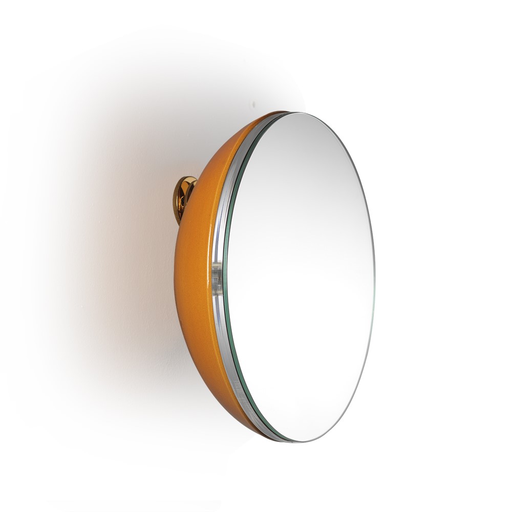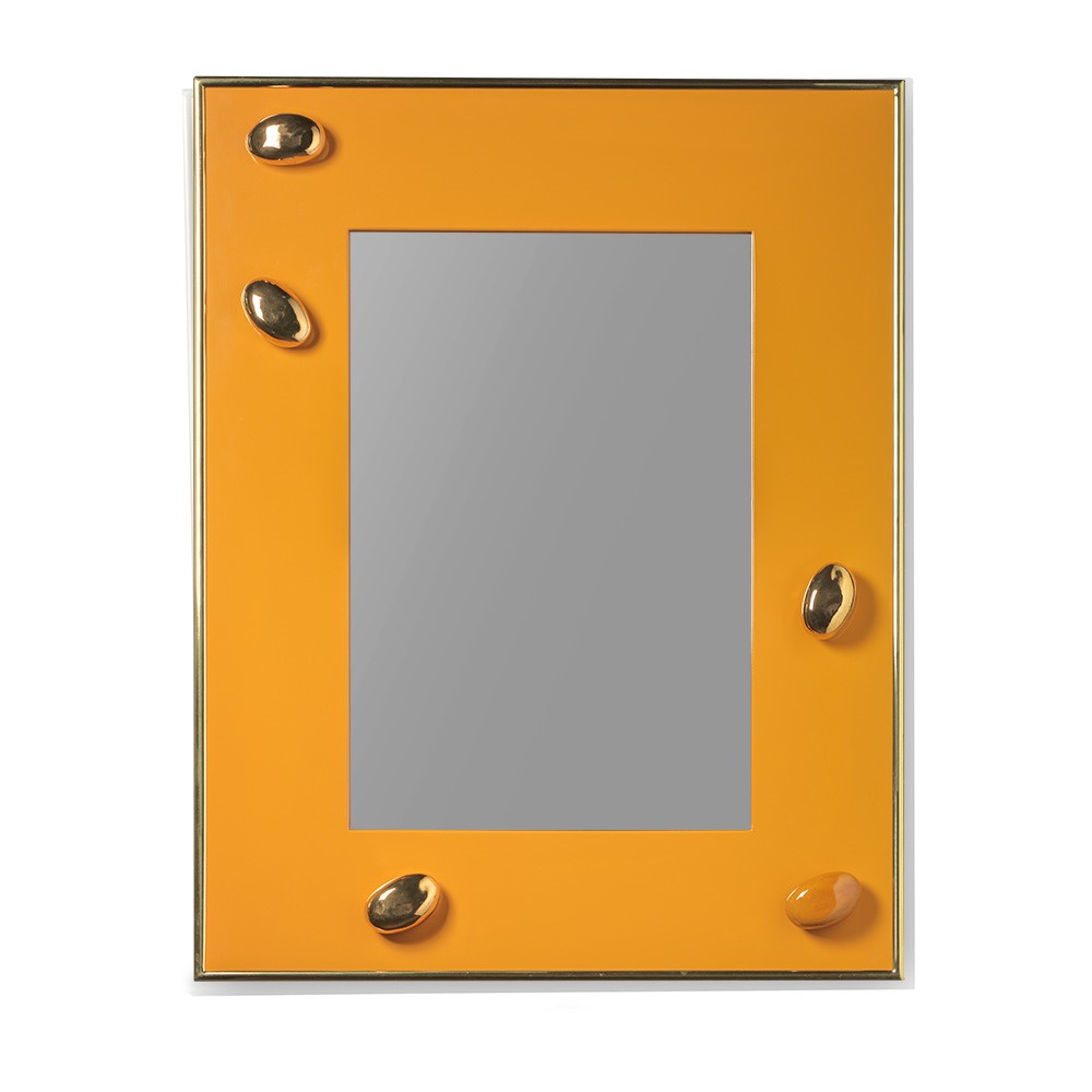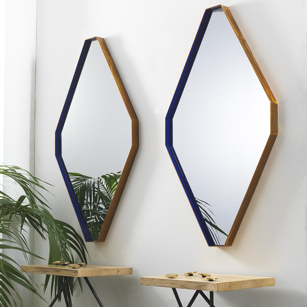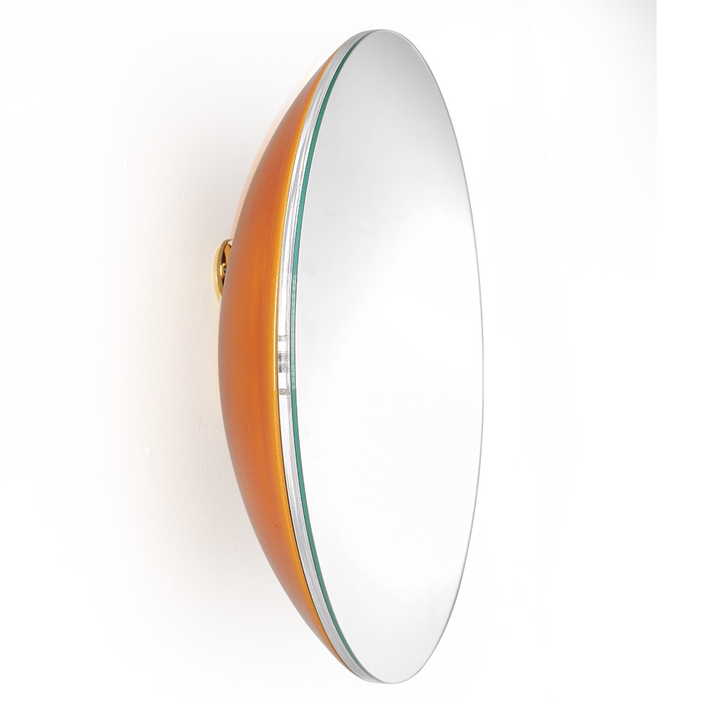 Frosted metal mirror. Frame with double lacquer: orange yellow outside and blue inside. The mirror is smoky but available in clear finish. You can position vertically and horizontally.