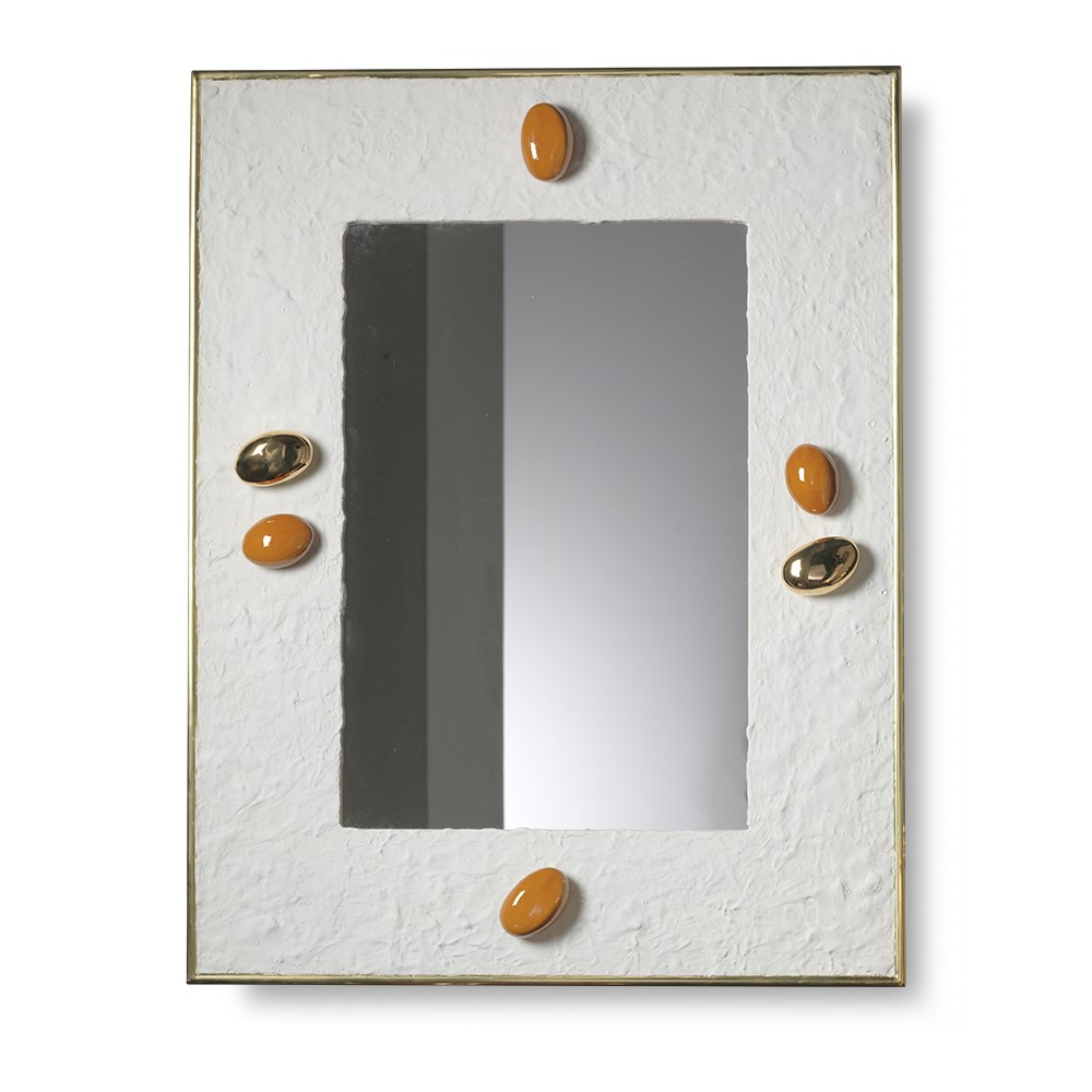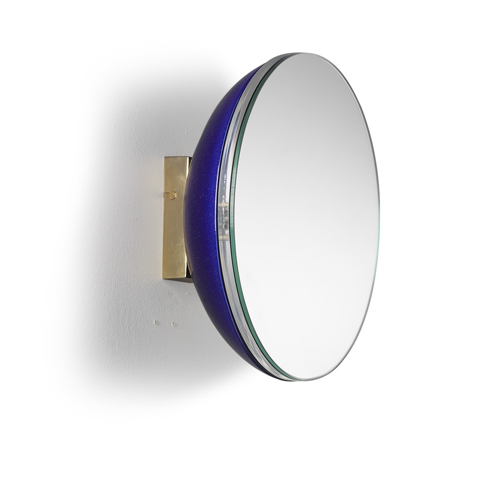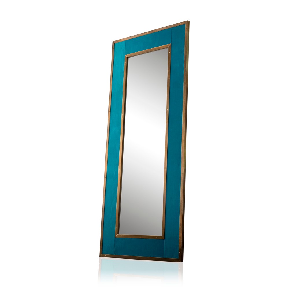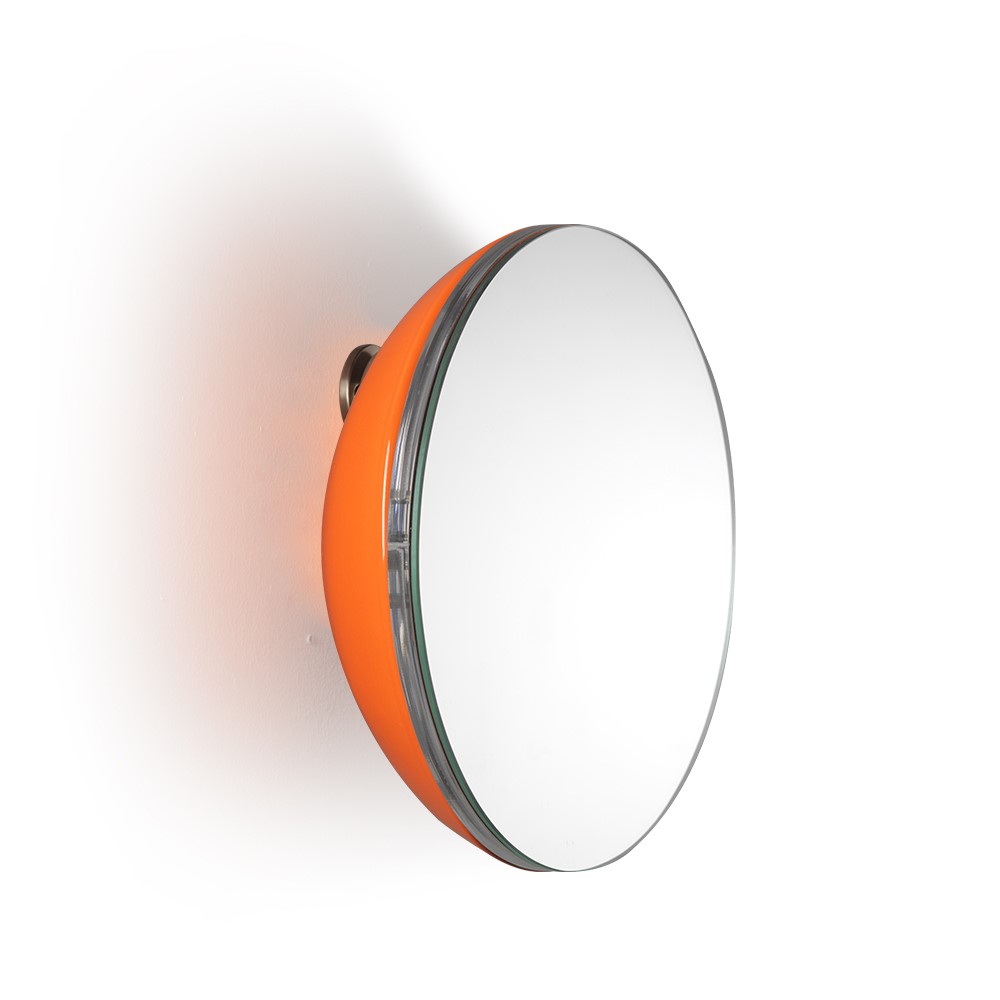 Frosted metal mirror. Frame with double lacquer: orange yellow outside and blue inside. The mirror is smoky but available in clear finish. You can position vertically and horizontally.
