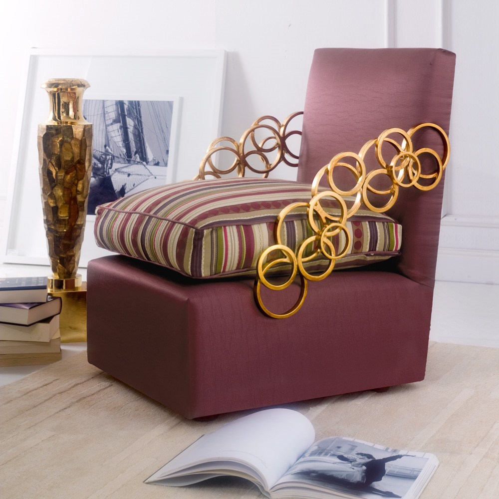 Armchair with forged, hand brushed, gilded iron arm rests. Inner cushion with quills feathers filling.