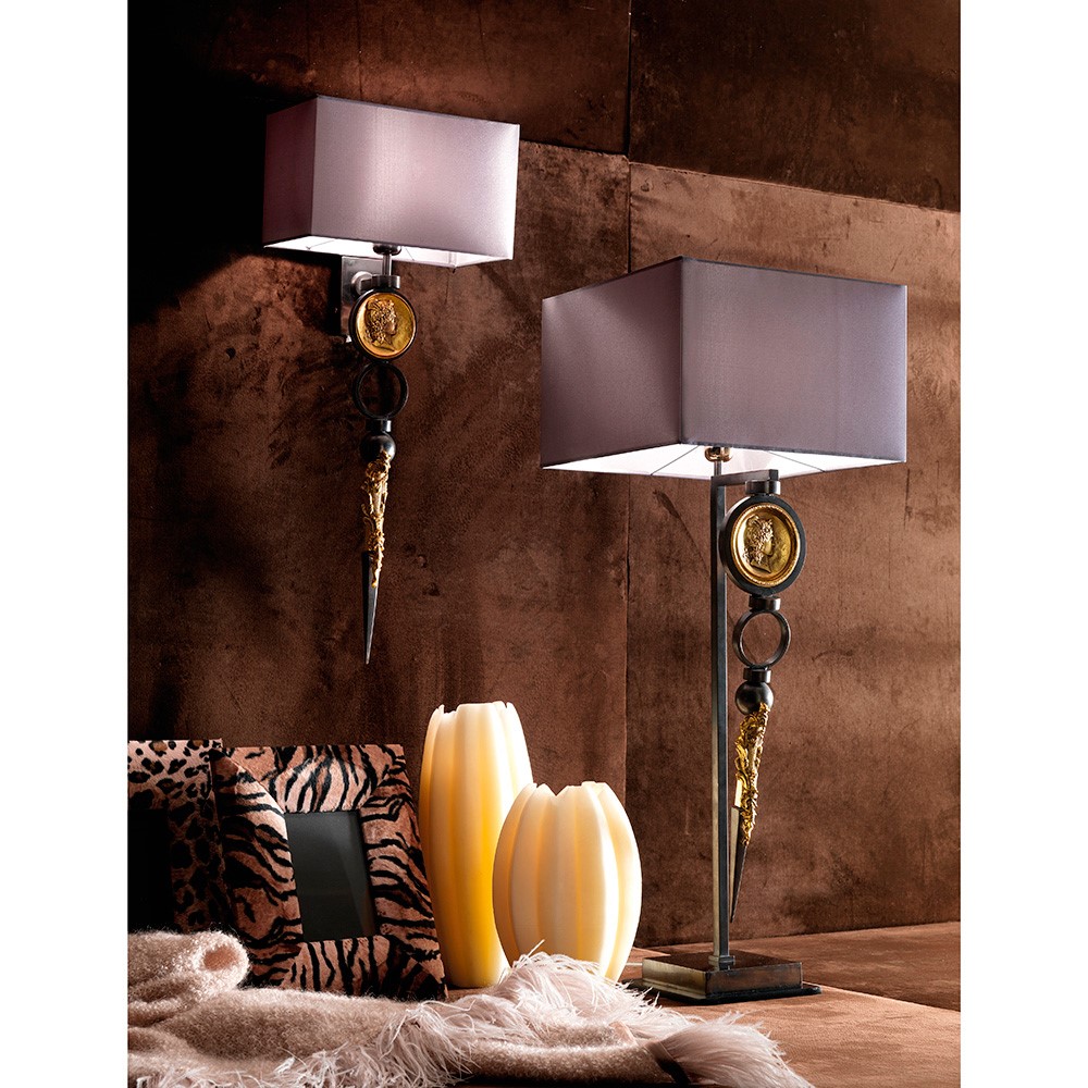 Golden bronze wall lamp in pewter colour. Grey silk taffeta lampshade; when on, the shade colour is mauve.