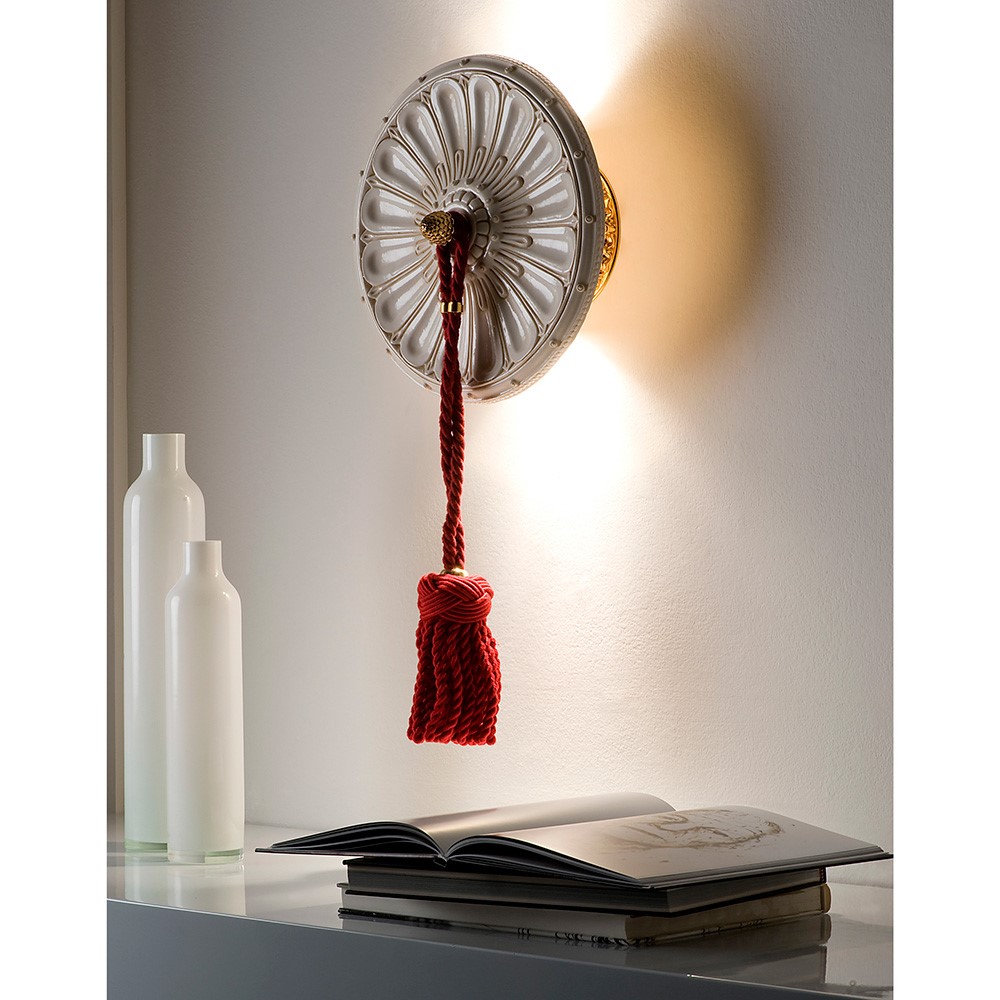 Wall lamp with golden bronze structure and hand engraved and glazed decorative majolica disk. Red silk tuft.