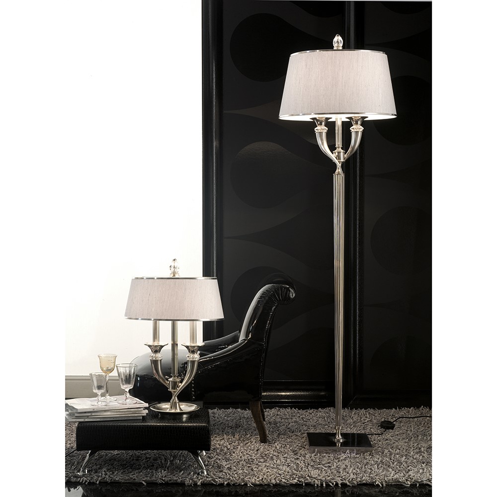 Bronze floor lamp, satin silver plated. Platinum plated majolica details and crystal details made by Swarovski® Elements. Lamè lampshade.
