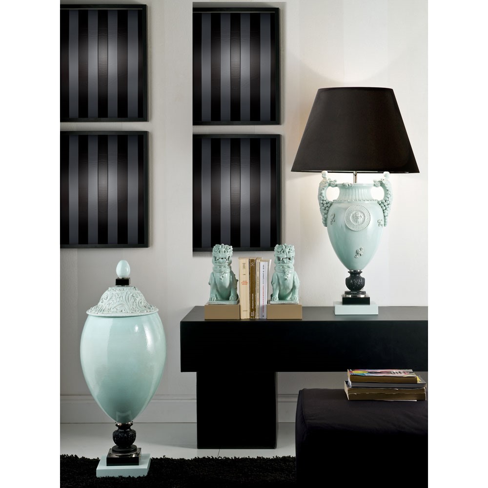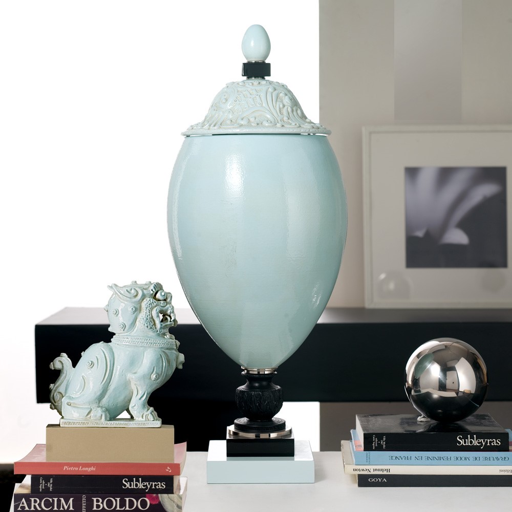 Majolica potiche, hand engraved and glazed. Chromed brass details and lacquered wooden base.