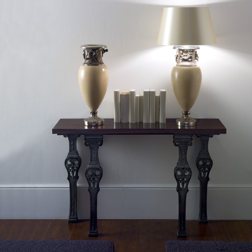 HISTORICAL ITEM OUT OF PRODUCTION - Wooden console table with hand carved, silver lead finish base. Makassar ebony surface.
