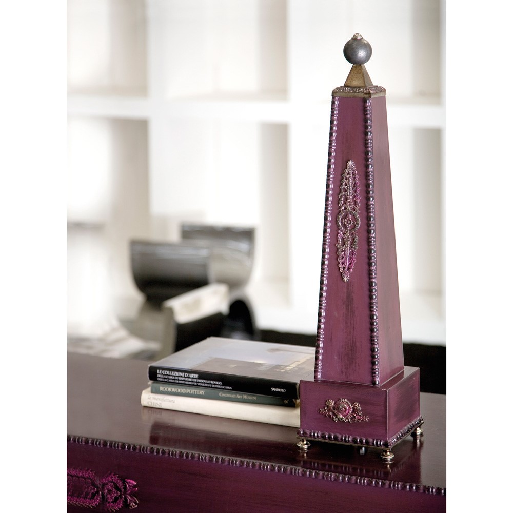 HISTORICAL ITEM OUT OF PRODUCTION - Plum colour lacquered wooden obelisc with bronze coloured embellishments and brass details.