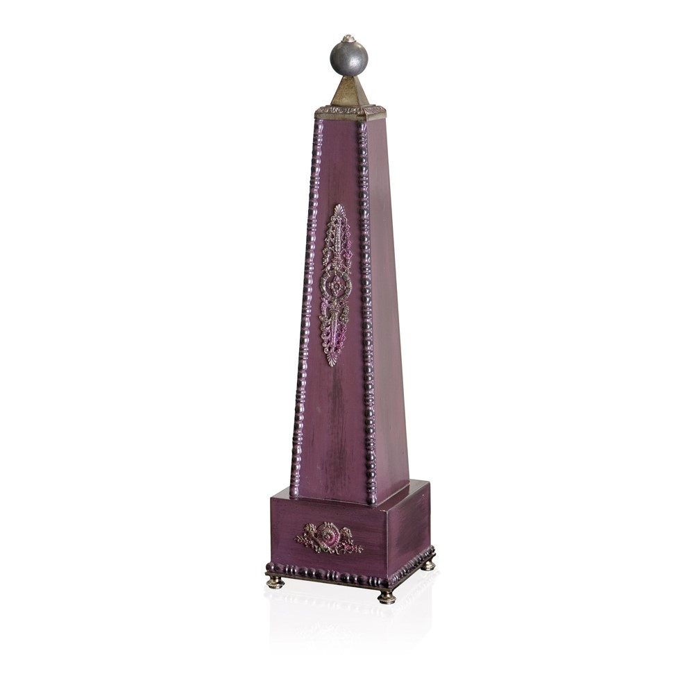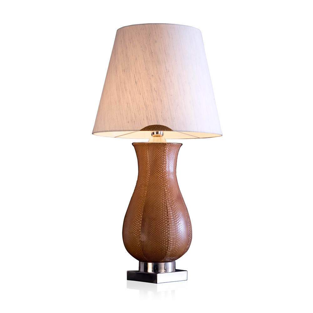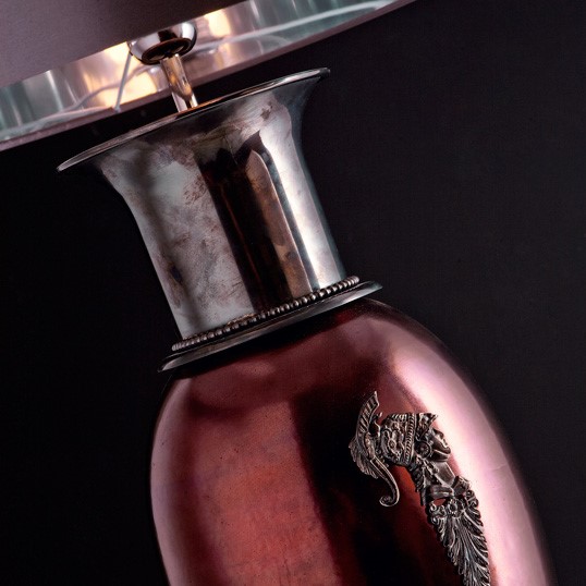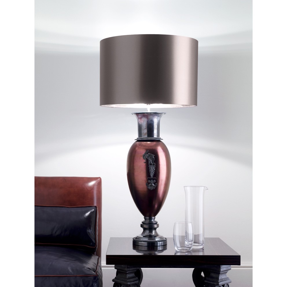 HISTORICAL ITEM OUT OF PRODUCTION - Lamp with red/copper majolica central element, the other parts are in pewter finish bronze. Grey silk satin lampshade with silver inside.