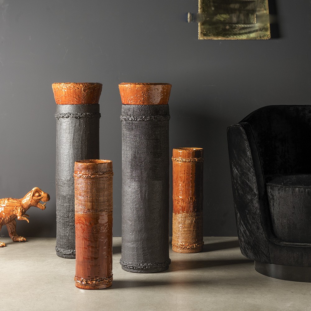 HISTORICAL ITEM OUT OF PRODUCTION - Hand-engraved majolica cylinder. The enamel is in gray lava and amber for the cover.