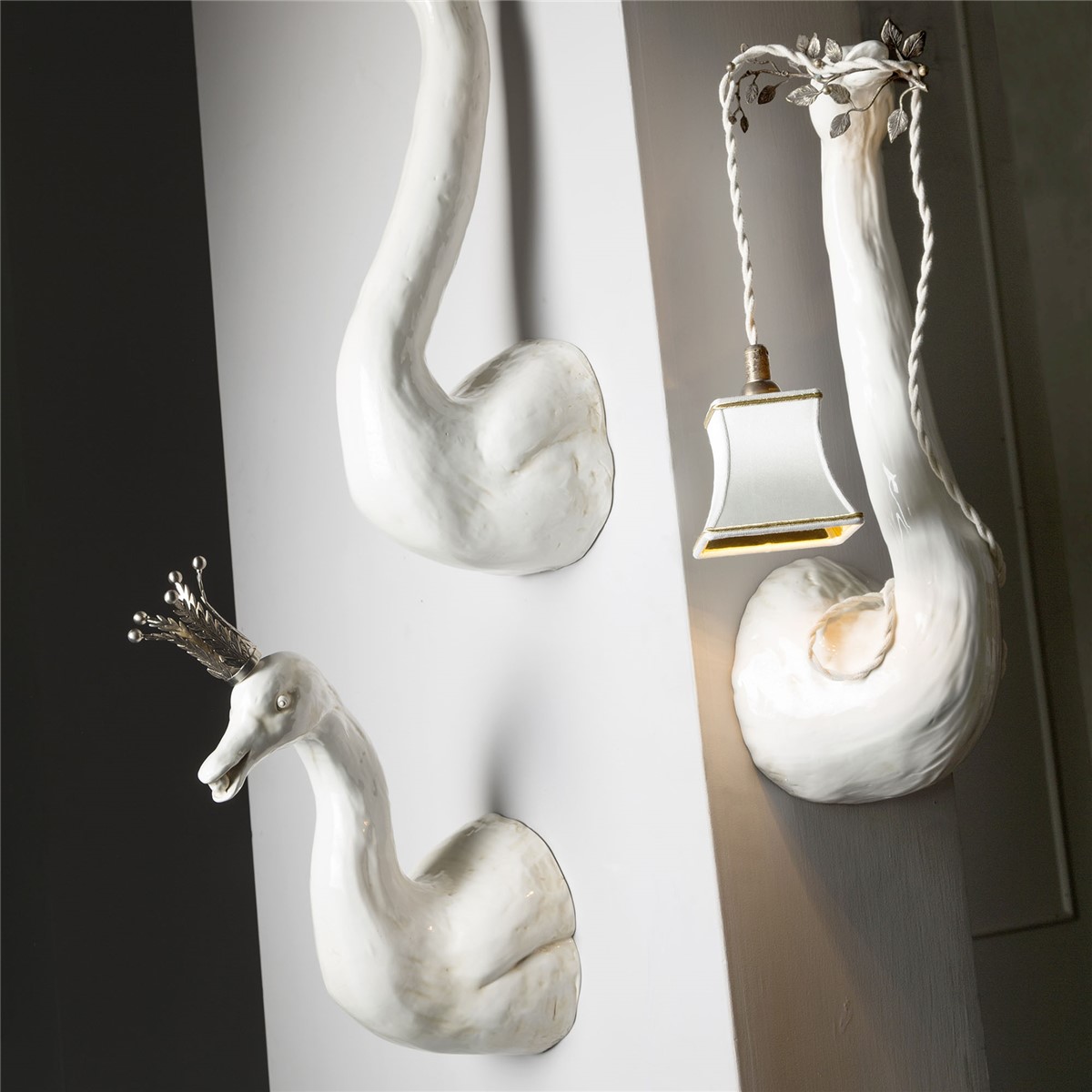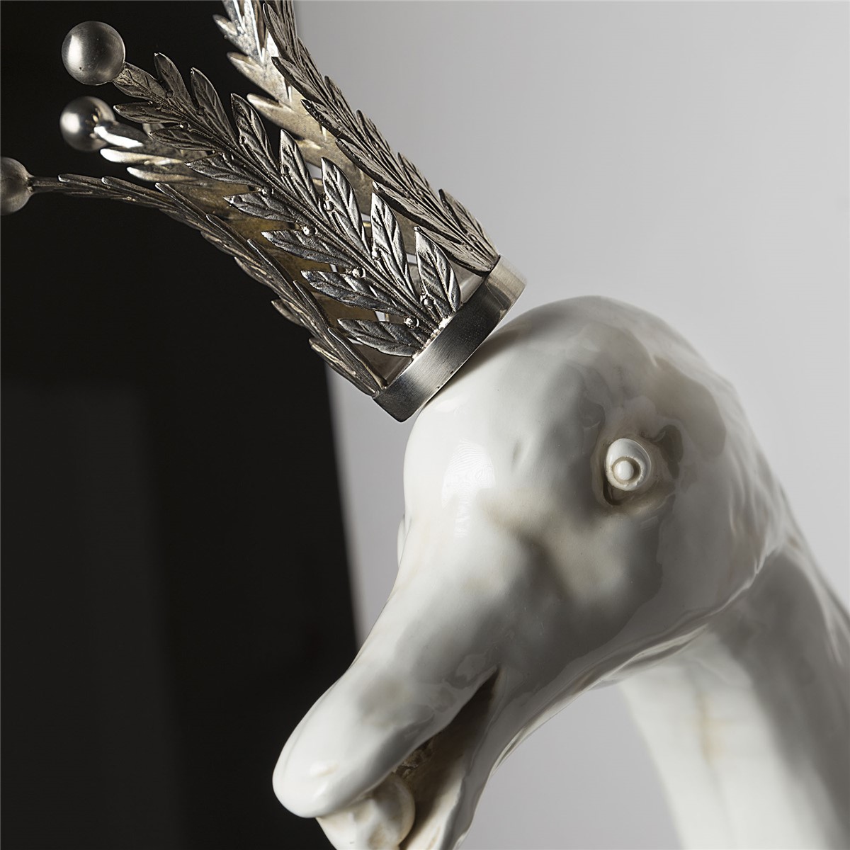 Majolica goose with grain in the mouth. Silver crown shifted to the left on the head.
