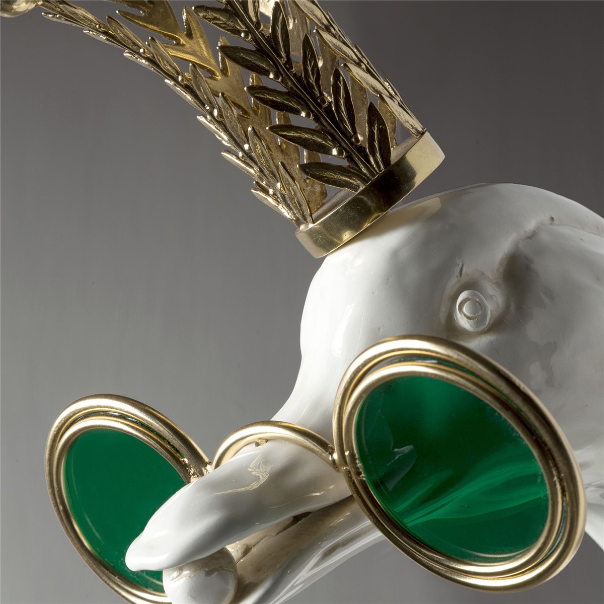 Majolica goose with grain in the mouth. Gold crown. Gold sun glasses with green lens.