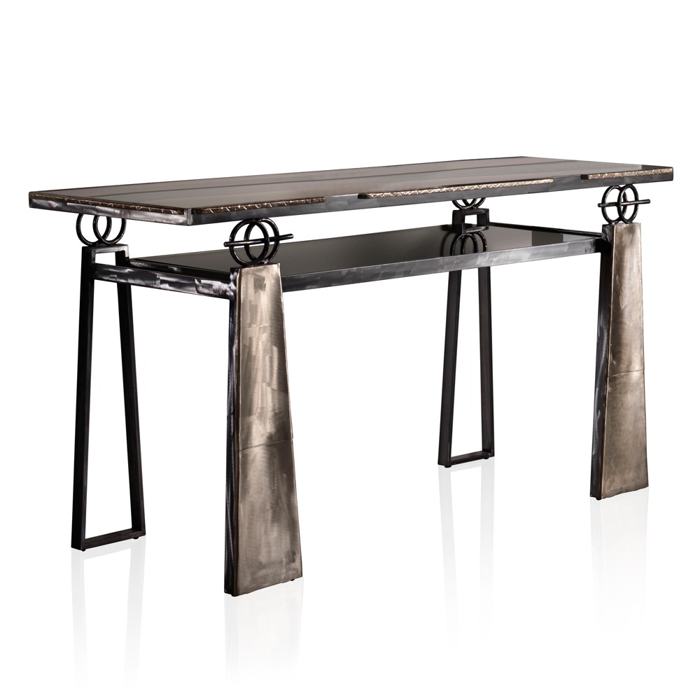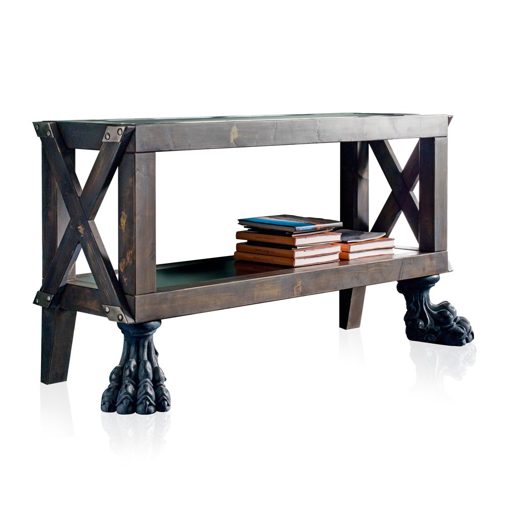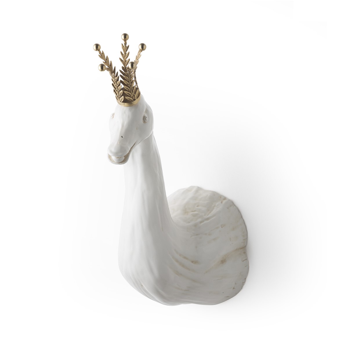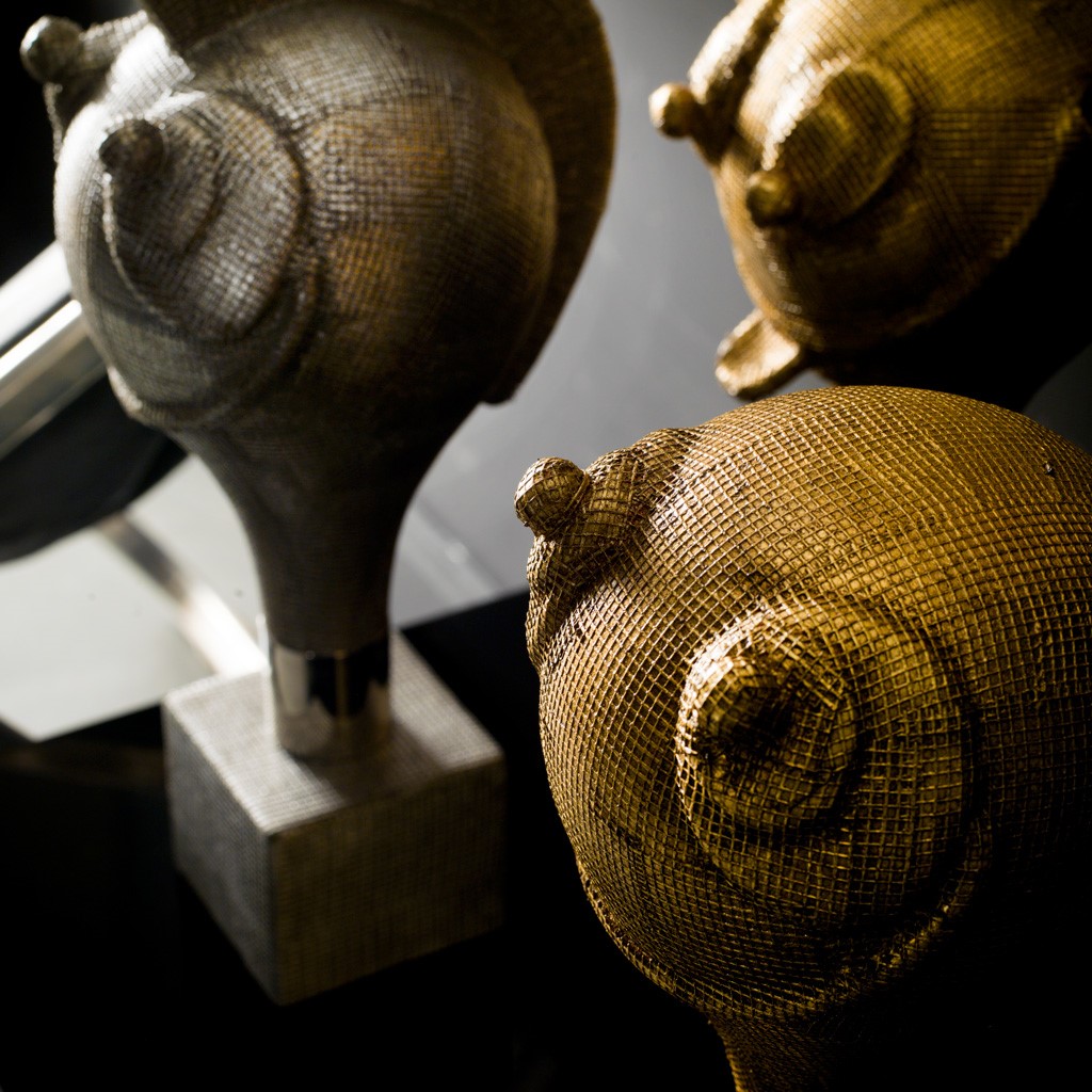 Object with majolica head and wooden base, entirely covered with golden leaf linen fabric. Golden brass details.
