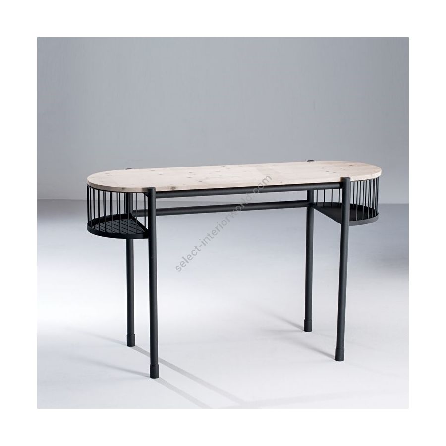 Die Etagere mit ihrer länglichen, symmetrischen Form ist, je nach Verwendungszweck, mit einer großen Arbeitsplatte oder Ablagefläche ausgestattet und wird darunter durch zwei Ablagefächer erweitert.