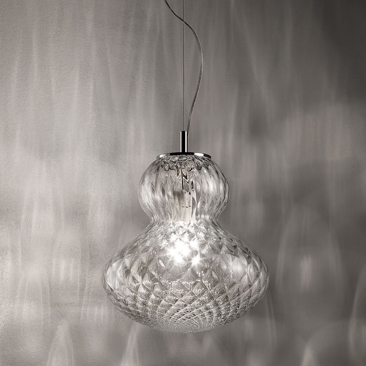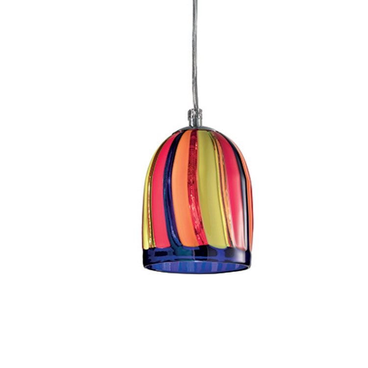 Nine types of textures enrich the simple shape of this bell always different in the strokes, obtained with an ancient decorative hot technique that involves the fusion of rods containing smooth wires in milk white or colored glass. Joyful individually, it becomes the perfect solution for custommade projects with an extremely creative look.