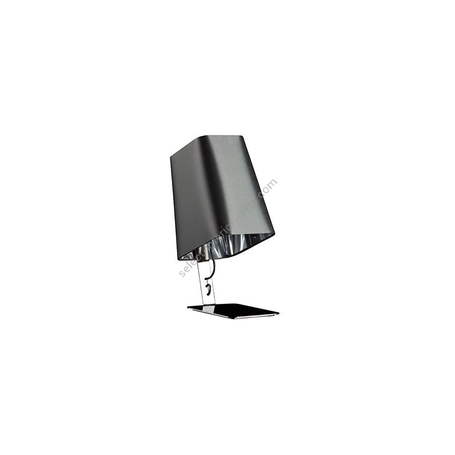 Niedrige Tischlampe mit Stahlstruktur mit poliertem Schwarznickel-Finish und Lampenschirm.