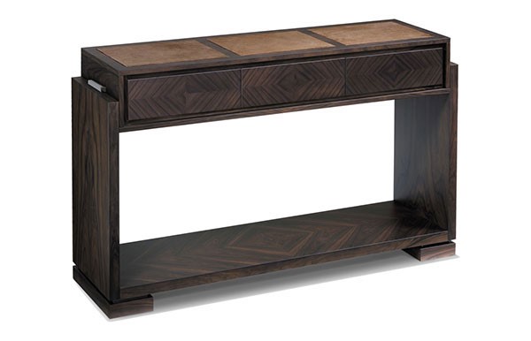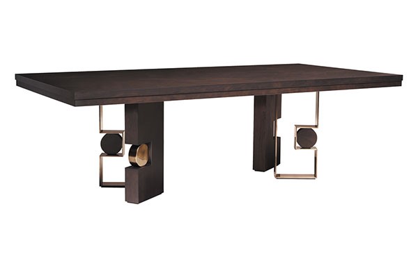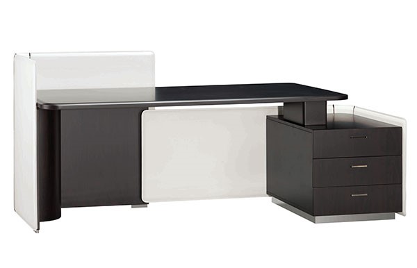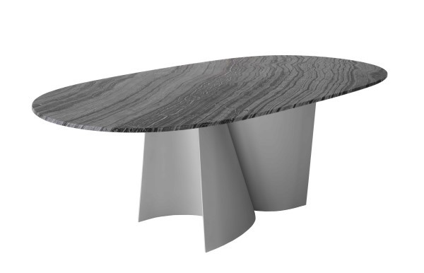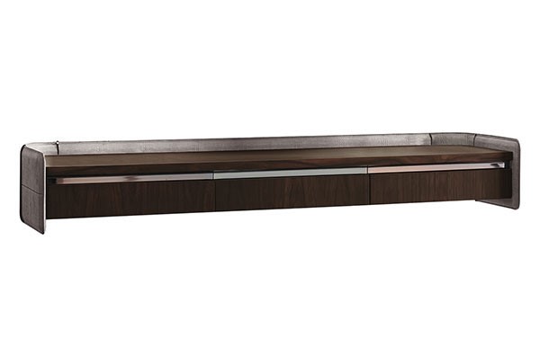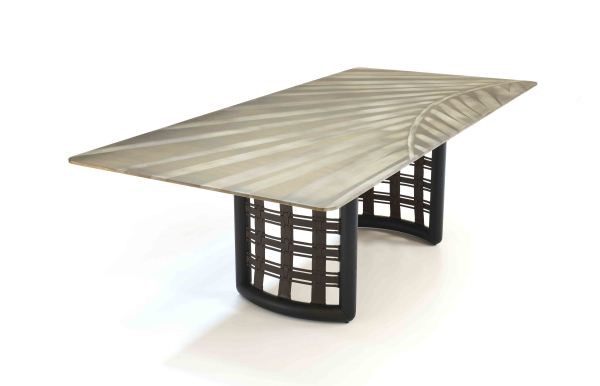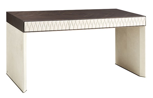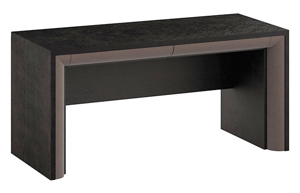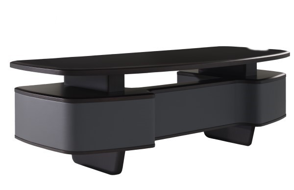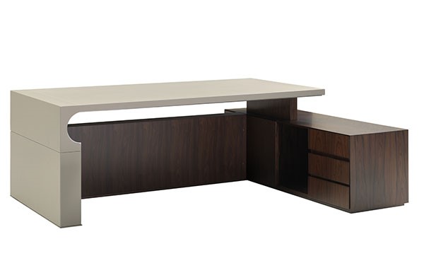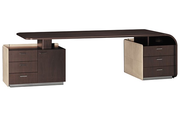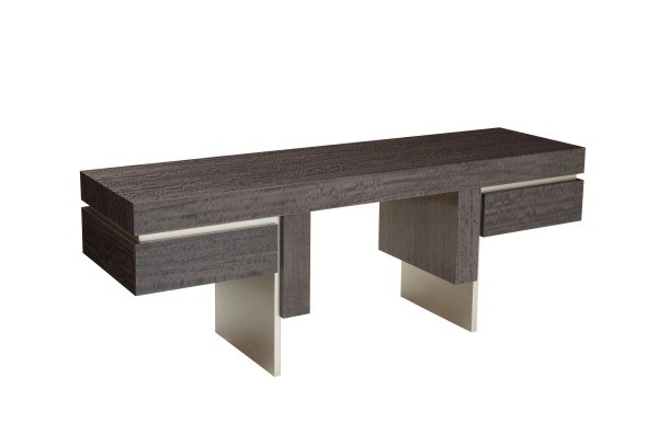 A towering desk, like a symbol of majesty and power. A wooden monolith supported by a slim steel base. Perimeter steel insert in three new finishes: Ice, Bronze and Honey. New wood: grey frisè eucalypt, but item available in burr walnut and rosewood.