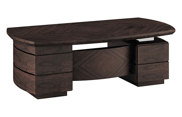 Matt rosewood or matt tobacco rosewood desk, 4 drawers, extractable top in leather or “MicroNabuk” finish, glazed effect steel details.