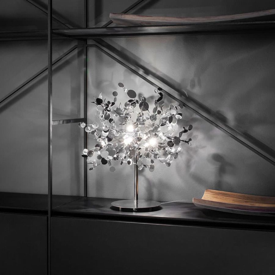 Dekorative Argent Tischlampe, entworfen von Dodo Arslan für Terzani. Argent besteht aus Metallscheiben, die von Terzani-Handwerkern sorgfältig von Hand zu Clustern geformt wurden. Sobald sie angezündet sind, strahlen die zahlreichen, abgewinkelten Oberflächen der Scheiben ein sanftes, schimmerndes Leuchten aus. Argent ist in Champagner, Edelstahl, vergoldet und Roségold erhältlich.