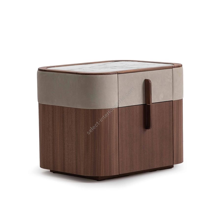 Kezia is a nightstand that mirrors the sophistication of its celebrated sideboard counterpart, featuring leather insets that enhance the structure and an integrated handle sculpted from solid American walnut. The marble top, selected from Ulivi Salotti's curated collection, introduces a refined material dimension. Kezia is conceived for those who appreciate harmonious interiors where beauty and expert craftsmanship converge effortlessly.