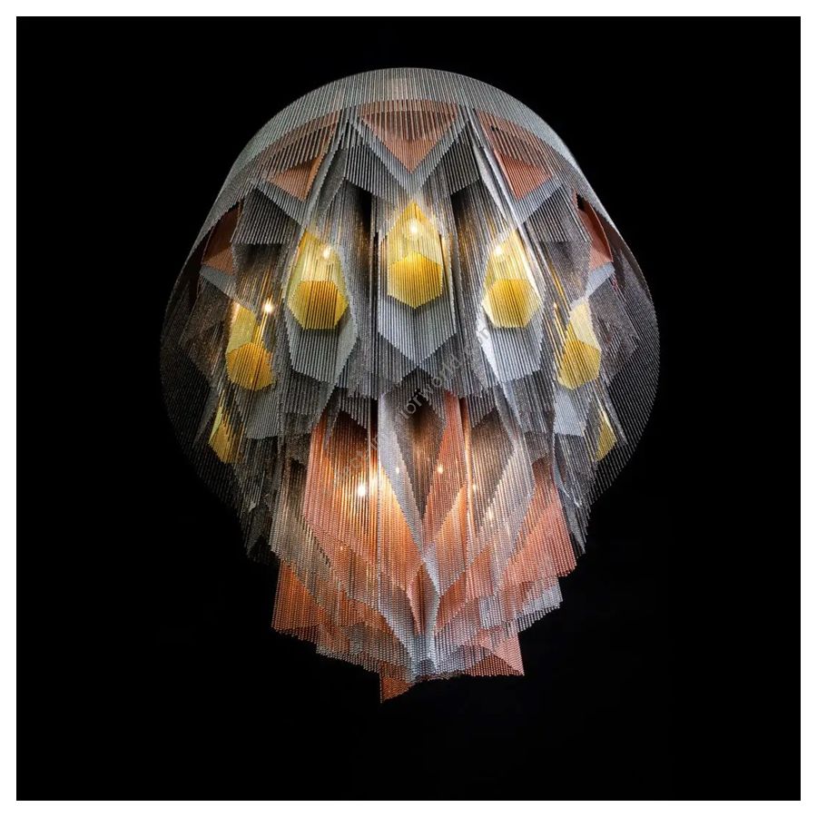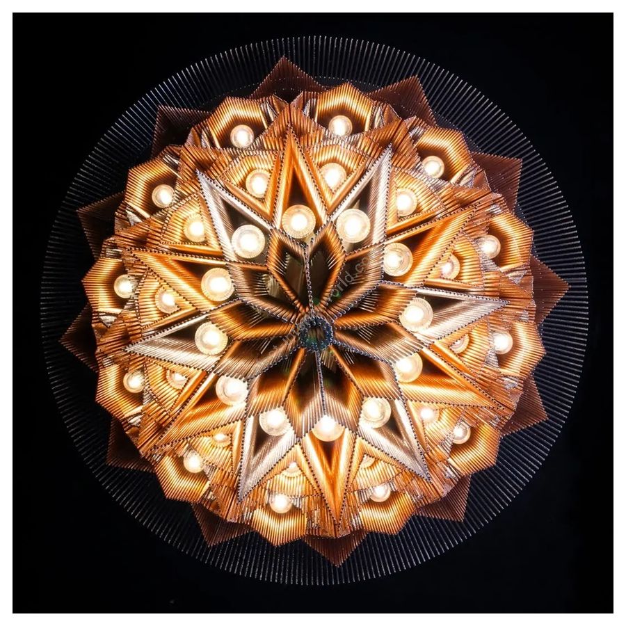 The ceiling mounted version of a massive intense Illuminated Mandala sculpture inspired by Islamic patterns which have been translated into three dimensions through the extrusion of the complex interlocking geometry. Illuminated by suspended G4 Halogenor LED lamps.