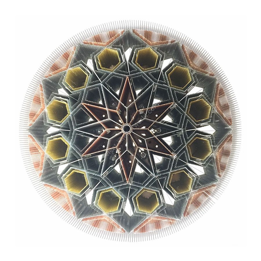 Die an der Decke montierte Version einer massiven, intensiv beleuchteten Mandala-Skulptur, inspiriert von islamischen Mustern, die durch die Extrusion der komplexen ineinandergreifenden Geometrie in drei Dimensionen übertragen wurden. Beleuchtet durch eine Kombination aus oberflächenmontierten und hängenden G4-Halogen- oder LED-Lampen. Mandala Nr. 2 ist eine „flachere“ Version als Mandala Nr. 1 mit einem aus jedem Winkel deutlicher erkennbaren Muster.