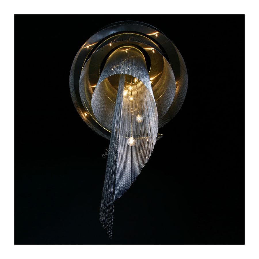 Ein spiralförmiger Kunstleuchter, inspiriert von einem holografischen Bild einer Kegelschale. Beleuchtet durch 3 elektrische Systeme. Zwei davon basieren auf G4-Halogen oder LED und das andere ist ein 5 m langes LED-Streifenlicht. Ideal für große Räume oder ein Treppenhaus.