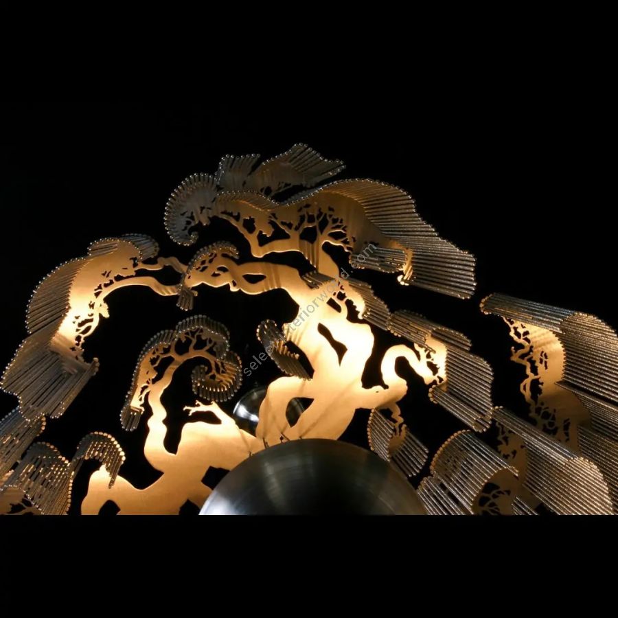 Ein von Bäumen inspirierter Kronleuchter, der aus einem gebogenen, zweidimensionalen Metallrahmen besteht. Beleuchtet durch 3xGU.10 Halogen- oder LED-Spots, die in einer hängenden, nach oben gerichteten Schale untergebracht sind.