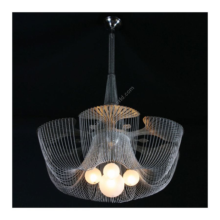 Ein Kronleuchterdesign, das auf der Form der Mondblume basiert. Beleuchtet durch eine hängende Clusteranordnung aus 5 Pyrexglaskugeln, die G9-Halogen- oder LED-Lampen enthalten.