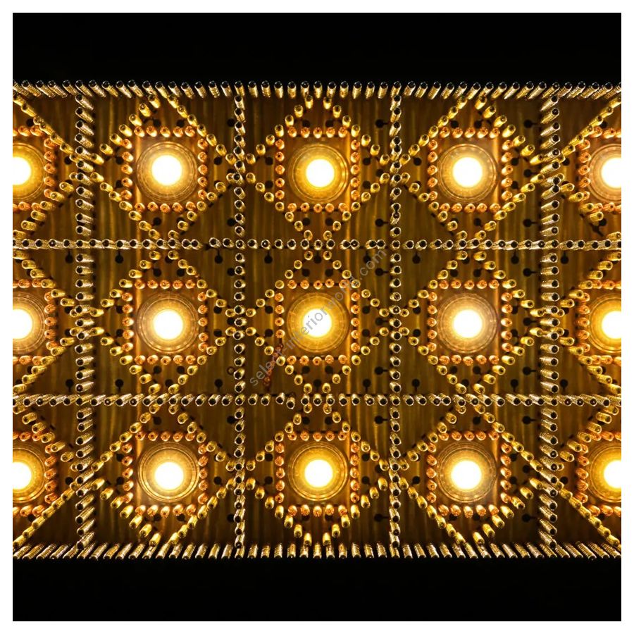 Eine moderne, minimalistische Pendelleuchte mit mehrschichtigem geometrischem Muster aus Quadraten und Rautenketten. Beleuchtet durch 45 G4-LEDs. Perfekt für einen Arbeitsplatz oder eine Büroumgebung.
