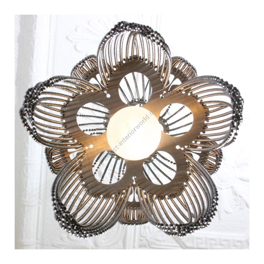 Eine kleine, „blütenknospenartige“ Miniatur-Kronleuchter-Hängelampe. Beleuchtet durch eine Pyrexglaskugel, die eine G9-Halogen- oder LED-Lampe enthält.