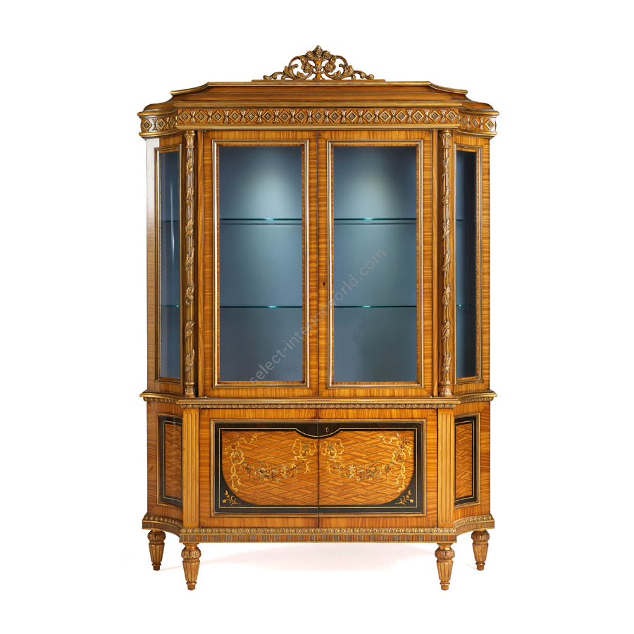 Vitrine im klassischen Stil mit zwei Türen. B/5142 ist in Citronnier und Ebenholz gehalten. Die Struktur ist mit Perlmuttdetails verziert und verfügt über eine Innenbeleuchtung. Die handwerkliche Verarbeitung nach der Tradition der Brianza verleiht diesem Einrichtungsgegenstand eine einzigartige und persönliche Note, die seine Schönheit zeitlos und für immer klassisch macht.