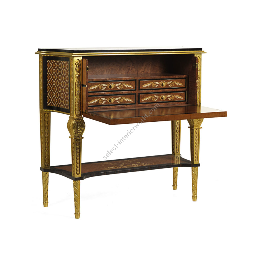 Eleganter Klappschrank im klassischen Stil, verziert mit Goldoberflächen, dessen Stil den wahren Geist hochwertiger klassischer Möbel ausstrahlt.