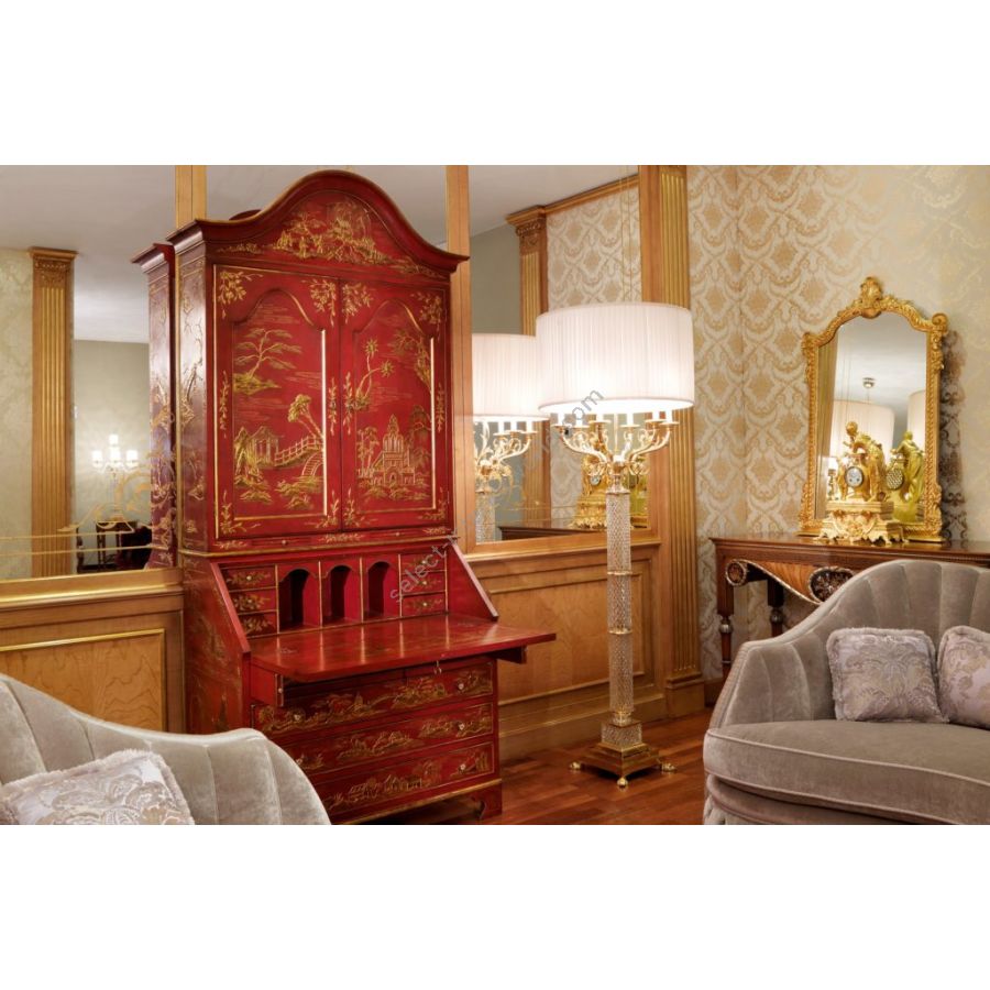 Handgefertigter Schrank im klassischen Stil mit bemerkenswerten Goldverzierungen, geräumiger Kommode, Regal und Flügeltüren. Eine detailreiche Einrichtungslösung aus edlen Materialien und innovativen Techniken in harmonischer Kombination.