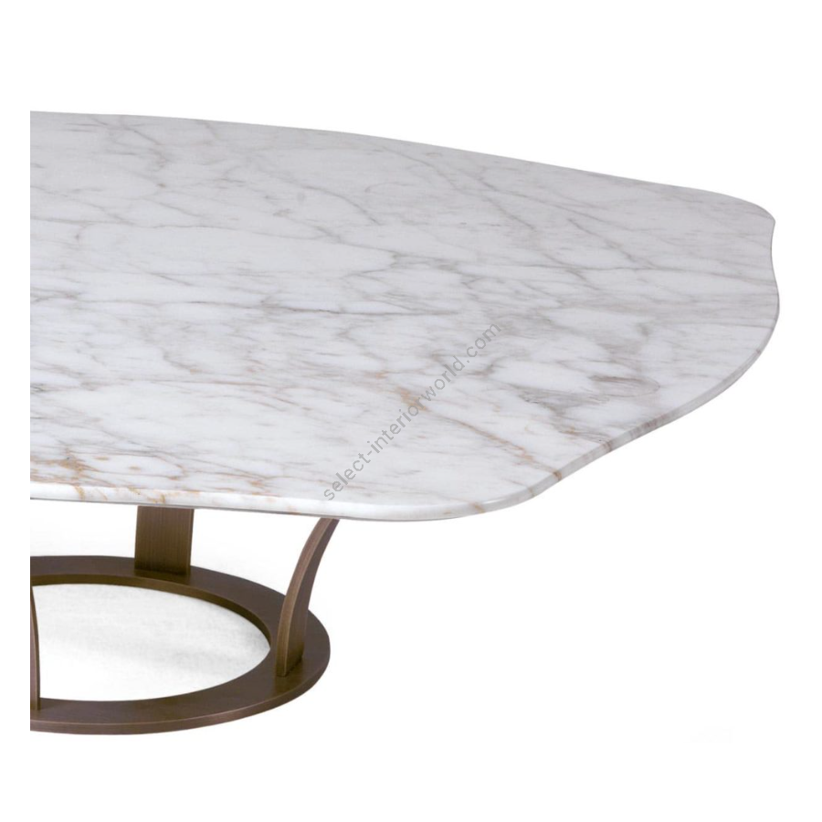 ROMANCE ist ein moderner Couchtisch mit schlichtem Design, das durch edle Materialien aufgewertet wird. Dieser Designer-Couchtisch verfügt über eine herrliche Marmorplatte mit natürlicher Maserung und eleganten Farbtönen. Die tragende Struktur besteht aus vier geschwungenen Beinen, die auf einem runden Sockel aus bronziertem Metall ruhen.