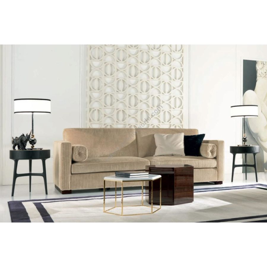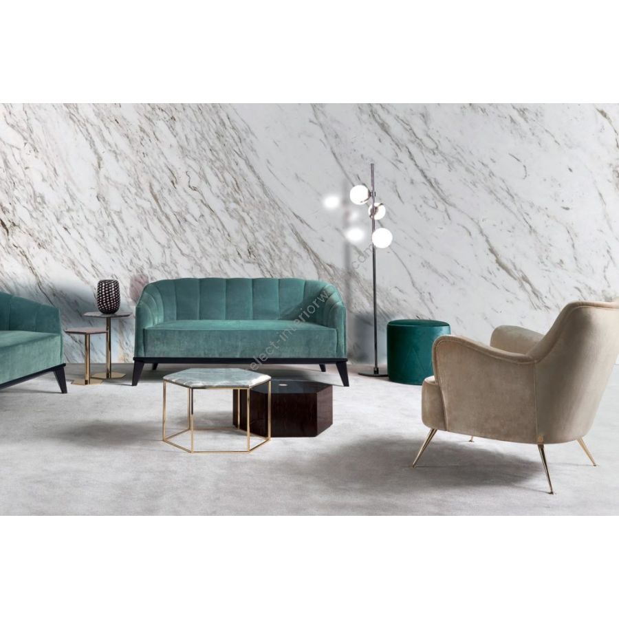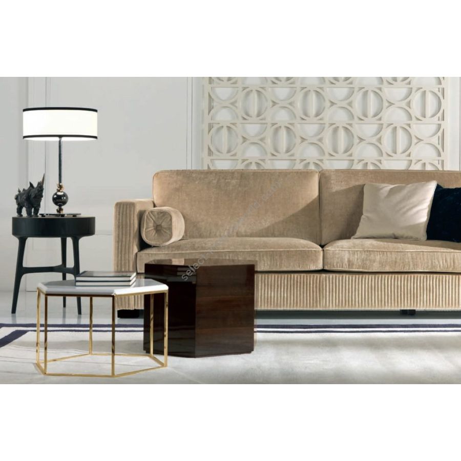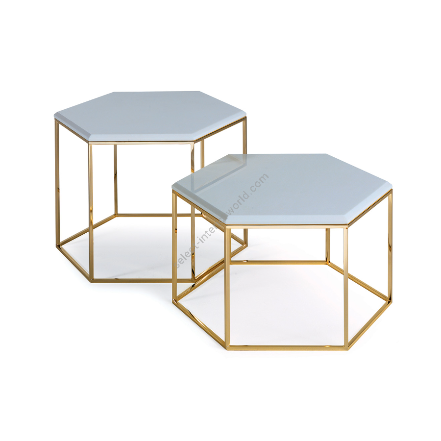 T178 ist ein Satz sechseckiger Tische mit Messingsockel und Marmorplatte. Die scheinbare Einfachheit dieser Elemente wird zu wahrer Schönheit und verbirgt ihre Komplexität in Design und Herstellung. Die kostbaren Goldoberflächen verleihen der Umgebung Charme und einen glamourösen und prestigeträchtigen Reiz.