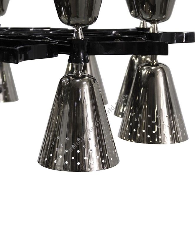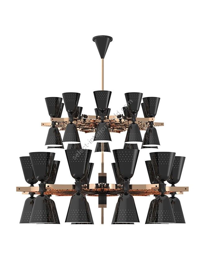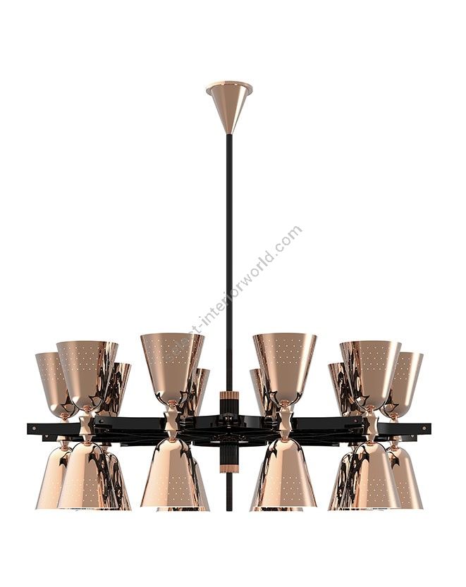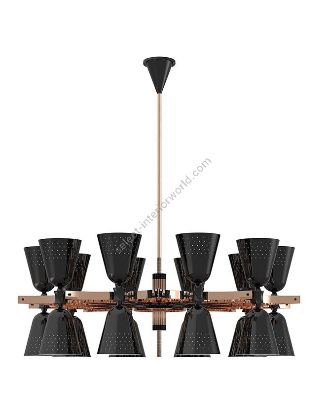 A revival of the mid-century modern design classics, Charles contemporary chandelier is a simple lighting design with a lot of character. It features 20 lampshades, all of them handmade in brass, with perforated details on the top. A copper plated finish is applied to the body of the lamp at the end of the process, creating a more contemporary vibe. The shades are lacquered a glossy black on the outside and a matte white on the inside, helping to create a more cozy light to the human eye. This copper pendant lighting can also be customized to have more shades, according to your needs. The right contemporary pendant light for a Scandinavian dining room, or a modern living room design.