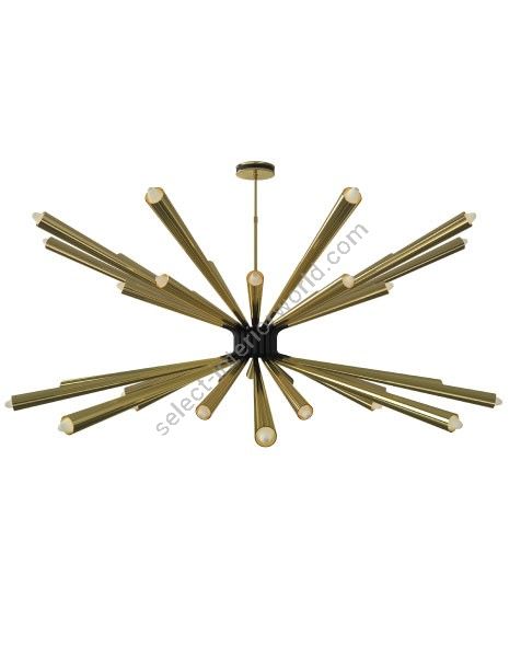 Inspired by the acclaimed jazz trumpet player Tommy Dorsey, this mid-century suspension chandelier is a unique lighting fixture that embodies the musicality of the 1950s. Allying the best of ancient techniques with the modern expertise of high- craftsmanship, Dorsey is a handmade brass chandelier, with aluminum lamp shades. The telescopic tubes that make up the body boast a gold-plated finish, while the lamp shades and center are lacquered a matte black. It is a unique chandelier, perfect for a mid-century hotel lobby, or an art deco-inspired restaurant. It can also be used in private residences, especially as a dining room lighting fixture.