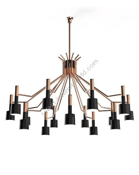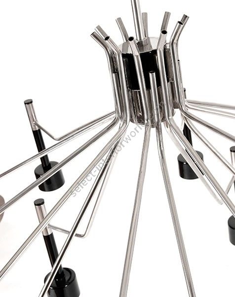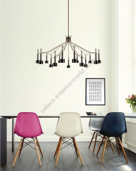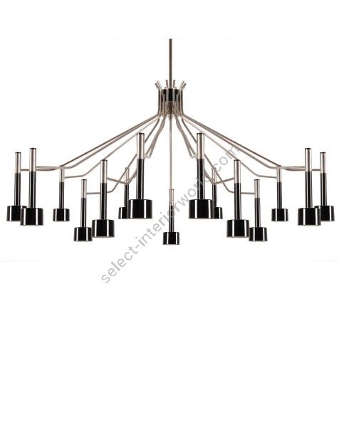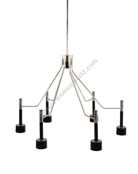 Ella round chandelier is a unique ceiling fixture which brings back the clean and sophisticated feelings of the mid-century modern era lived in the 1960’s Palm Springs. With a body 100% handmade in brass and its lampshades made of aluminum, this lighting design was reinvented using today’s technical skills paired with the traditional craftsmanship and know-how of some of the best portuguese artisans. The body has a nickel plated finish, while the lampshades are lacquered a glossy black for a sleeker look. It is available both in the 6 or 15 arms versions. An iconic mid-century modern chandelier, perfect for a contemporary living room or dining area.