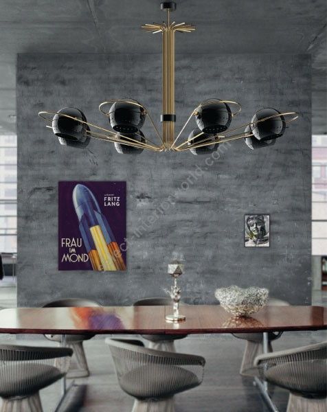 Neil is a modern chandelier with round arcs and spherical diffusers, that were inspired by the golden years of space exploration in the 60’s. It has 8 arms with rotating spheres to cast light to wherever you need in order to create the perfect mood - a rare feature on chandeliers. Therefore, this iron chandelier casts ambient light in all directions. It also offers the choice of having only 4 of the 8 diffusers lit on. With a structure handmade in iron and 8 lamp shades in iron, Neil black chandelier has a mid-century modern design with glossy black exterior and a matte black interior finishing. Ideal as a modern dining room lighting or as a centerpiece in your mid-century living room, Neil will add an innovative touch to your interior design.