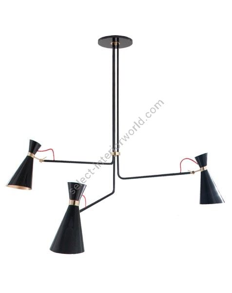 Nina Simone was the inspiration for this dazzling mid-century modern chandelier. Handmade in brass, this modern lamp has three lamp shades in aluminum that feature a glossy black finish and three visible textile red wires above the large lamp shades. This retro style chandelier is 35 inches tall and the pole height is 19.7“, but it can be customizable on purchase. The three arms are united by a gold plated ring, showing a high level craftsmanship. The big lampshades, the asymmetric structure, the visible textile wire and the nickel plated details have resulted in a huge pendant lamp which will surely put a spell on you.